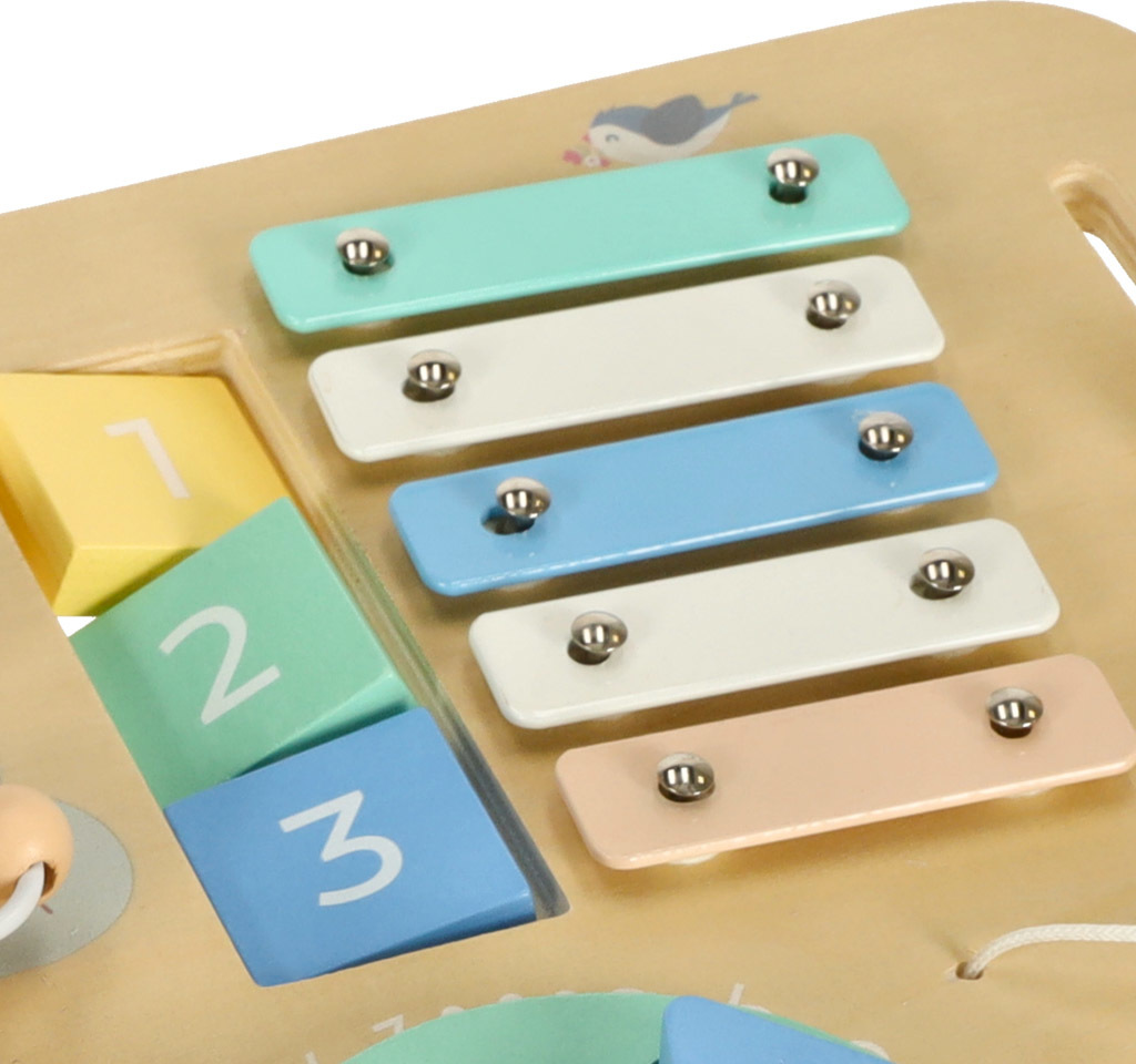 Je vyrobený z dreva so zaoblenými hranami, čo zaručuje bezpečnosť pri hre. Všetky prvky sú natreté netoxickými farbami, takže sú pre batoľatá bezpečné. Pastelové farby sú pútavé a dokonale zapadajú do detskej izby. Výrobok spĺňa všetky európske bezpečnostné normy a je certifikovaný CE.
