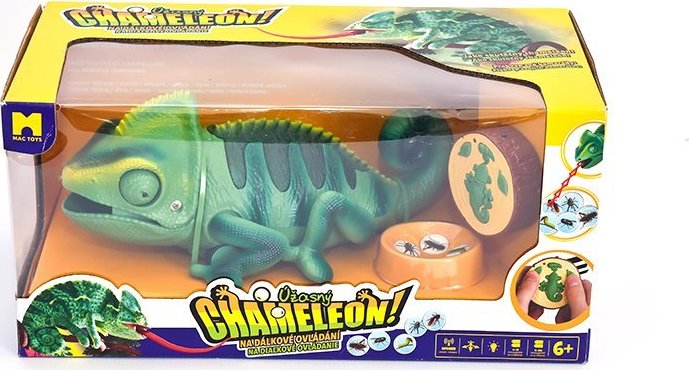 Chameleón na diaľkové ovládanie. Mení farbu, hýbe chvostom a vystrkuje jazyk, na ktorý chytá hmyz. Na prevádzku sú potrebné batérie 4 x 1.5V AA a 2 x 1.5V AAA (nie sú súčasťou balenia). Vhodné pre deti od 6 rokov.Vlastnosti