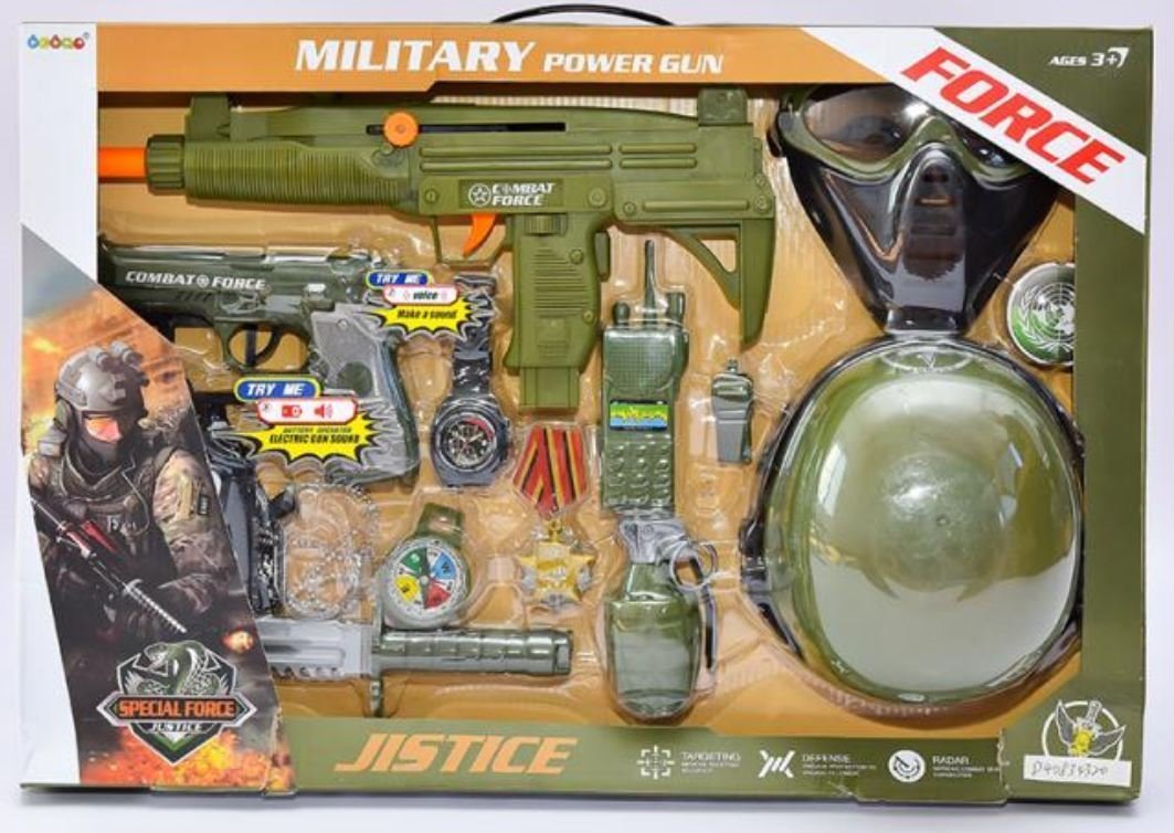 Super vojenská sada pre každého vojaka! Súprava pre malého vojaka s helmou, pištoľou a ďalším príslušenstvom. Set vyžaduje 2 x 1.5V AG13 batérie, ktoré nie sú súčasťou balenia.Vlastnosti