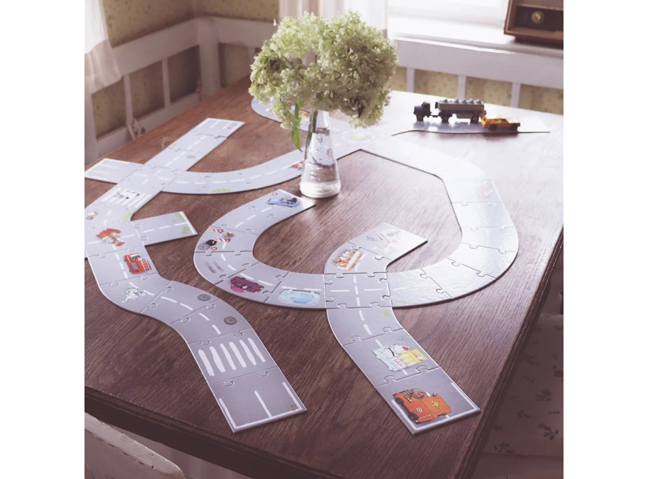 V tejto ulici sa každú chvíľu niečo deje! Zúčastnite sa so zvieratkami vzrušujúcich pretekov a nebojte sa šliapnuť na pedál! Predbehnite veľrybie mláďa v jeho akváriu, vyhnite sa čítajúce sa sovo s nebezpečne sa hojdajúcou hromadou kníh - len dávajte pozor na neposedných chodcov ... Či už je to križovatka, kruhový objazd, zákruta alebo rovinka - s dielmi šikovného formátu si deti od 4 rokov môžu postaviť vlastnú cestu tak, ako sa im zapáči, a pritom organizovať zábávne preteky aj v bezpečí svojej izbičky.