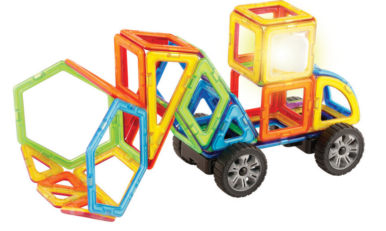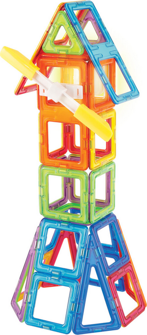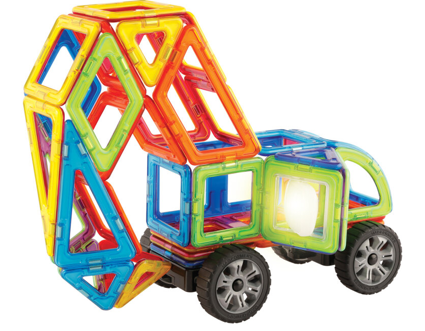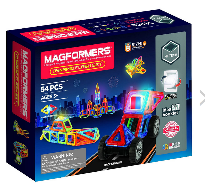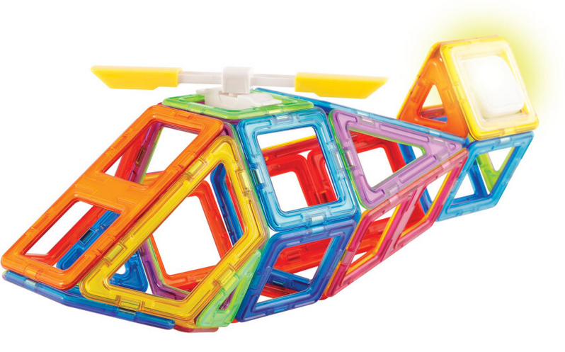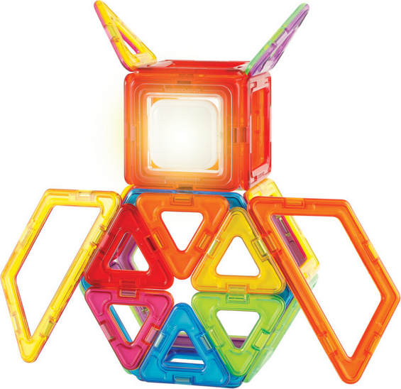 Táto nová univerzálna stavebnica poskytuje stavby nepreberného množstva modelov od zvierat a palácov až po šperky a rôzne dopravné prostriedky. Najvýraznejším prvkom je nový typ lucerny, ktorá sa otáča vo vnútri štvorcového rámčeka okolo stredovej osi o 360 °. Stláčaním prepínača je možné voliť rôzne farby a svetelné režimy, takže v prítmí môže každá stavba slúžiť ako unikátna lampička. Nastaviť je možné napr. režim blikajúceho policajného majáku, stavebné a hasičské svetlá, alebo svietiť nepretržite. Stlačením a podržaním tlačidla po dobu 3 sekúnd LED lampáš vypnete alebo sa sama automaticky vypne po 10 minútach. Balenie obsahuje tiež nový typ vrtule s 2 roztiahnuteľnými listami, ktorú je možné v zloženom stave použiť aj ako výstražný maják napr. pre policajné autá, stavebné stroje či vozidlá a člny záchrannej služby (na rozdiel od LED lucerny však bez svetelného zdroja). Nové kolieska môžete navzájom medzi sebou prepojiť vďaka háčiku na strane nápravy. Takto môžete vytvoriť stabilnú konštrukciu áut. Pre prevádzku LED lucerny je potrebná batéria CR2032, ktorá je vymeniteľná (je súčasťou balenia). Počet dielikov: 54 dielikov + obrázkový návod: 12 trojuholníkov 22 štvorcov 4 vysoké trojuholníky 3 obdĺžniky 2 výseče 1 oblúk 2 šesťuholníky 2 lichobežníky 2 kosoštvorce 1 vrtuľa, siréna 2 podvozky koliesok 1 otočná LED pomocou dvojrozmerných plastových mnohouholníkov. Magformers precvičuje jemnú motoriku, podnecuje tvorivosť, učí deti farby a základné geometrické tvary. Rozmery dielikov a vhodne volené tvary zaisťujú maximálnu možnú bezpečnosť hračky. Materiál, z ktorého je stavebnica vyrobená spĺňa najprísnejšie hygienické a zdravotné kritériá. Dieliky sú dostatočne veľké, nemožno ich prehltnúť a sú prakticky nerozbitné. MAGFORMERS je možné veľmi dobre kombinovať aj so známou magnetickou stavebnicou Geomag.Vlastnosti