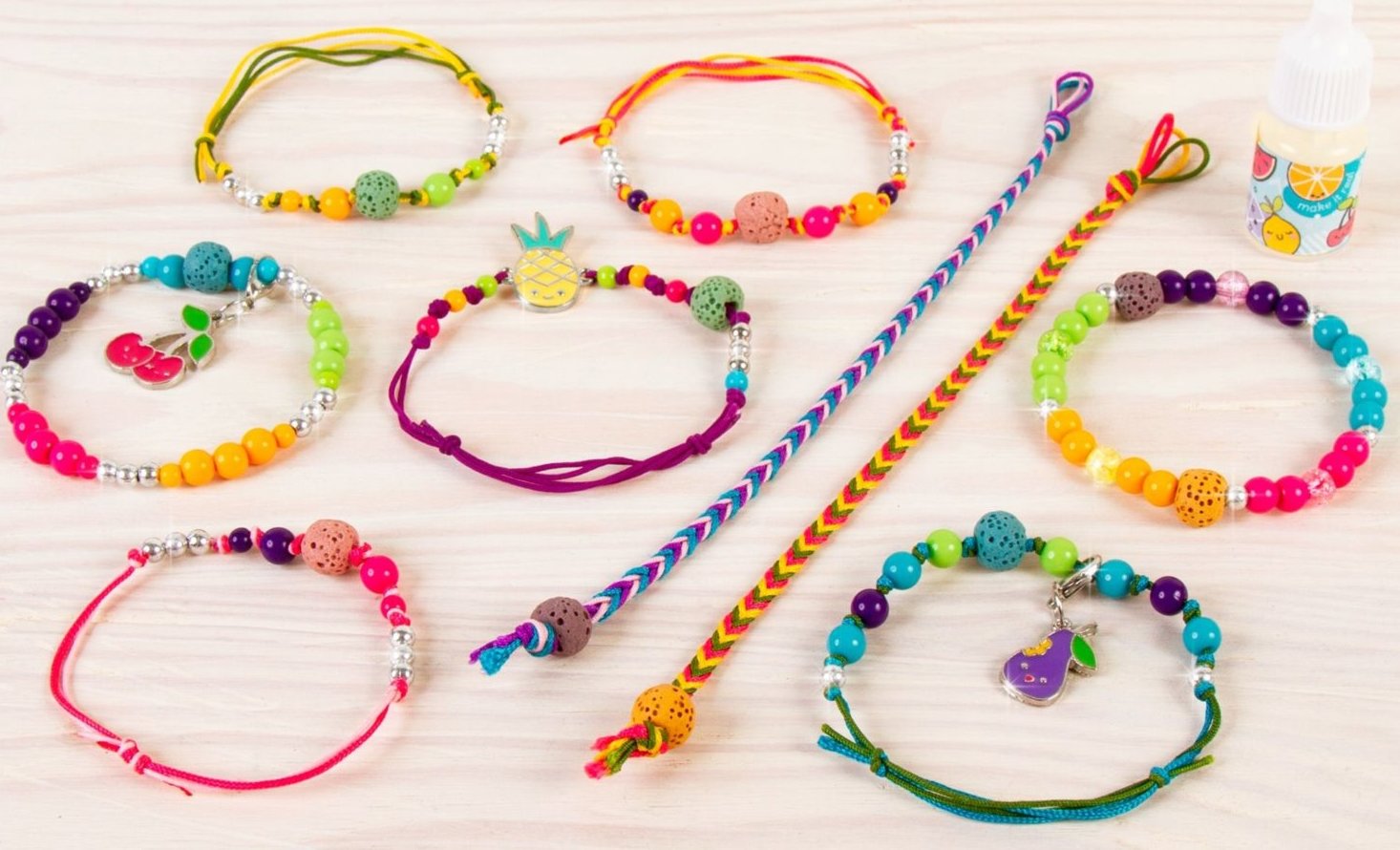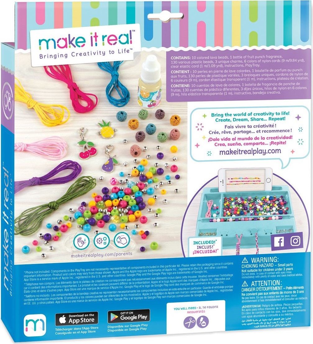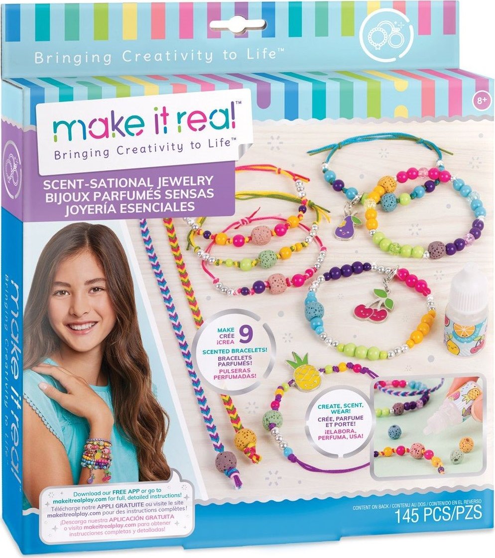 Vyrob si sadu voňavých náramkov, ktoré nikto iný nemá. Vytvor si originálne náramky s lávovými korálkami, napusť ich vonnou esenciou a okúzli svoje okolie. Pomocou sady na výrobu náramkov ti to pôjde jedna radosť. Spolu s kamarátkami vytvorte tie najkrajšie doplnky! Sada obsahuje: - 10 lávových korálikov - 1 fľaštičku ovocnej vône - 130 plastových korálikov - 3 prívesky - 6 farebných nylonových povrázkov (9 m) - priehľadný elastický povrázok (1 m) - plastový podnos na tvorenie náramkov - obrázkový návod Vhodné pre deti rokov.Vlastnosti