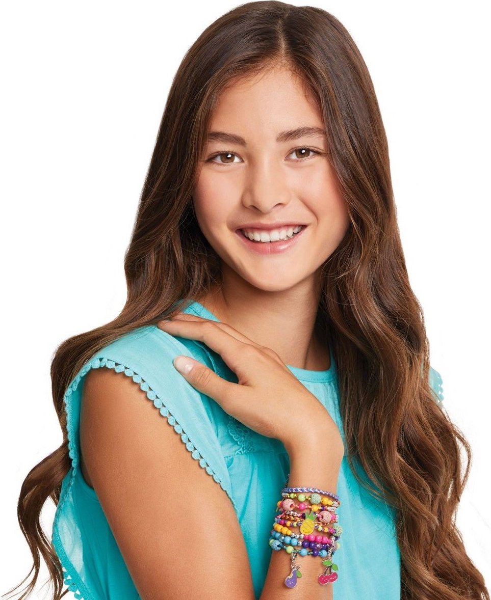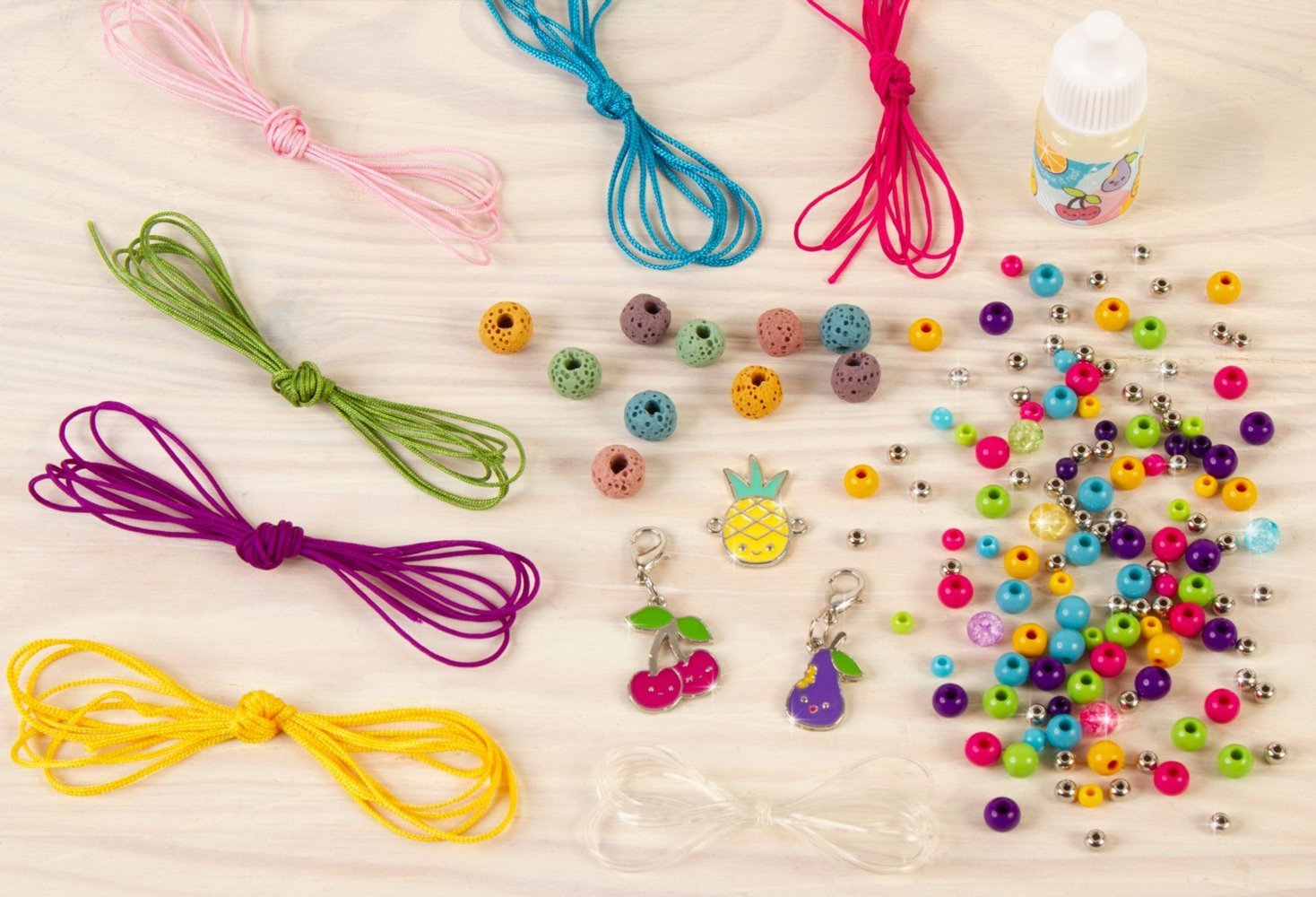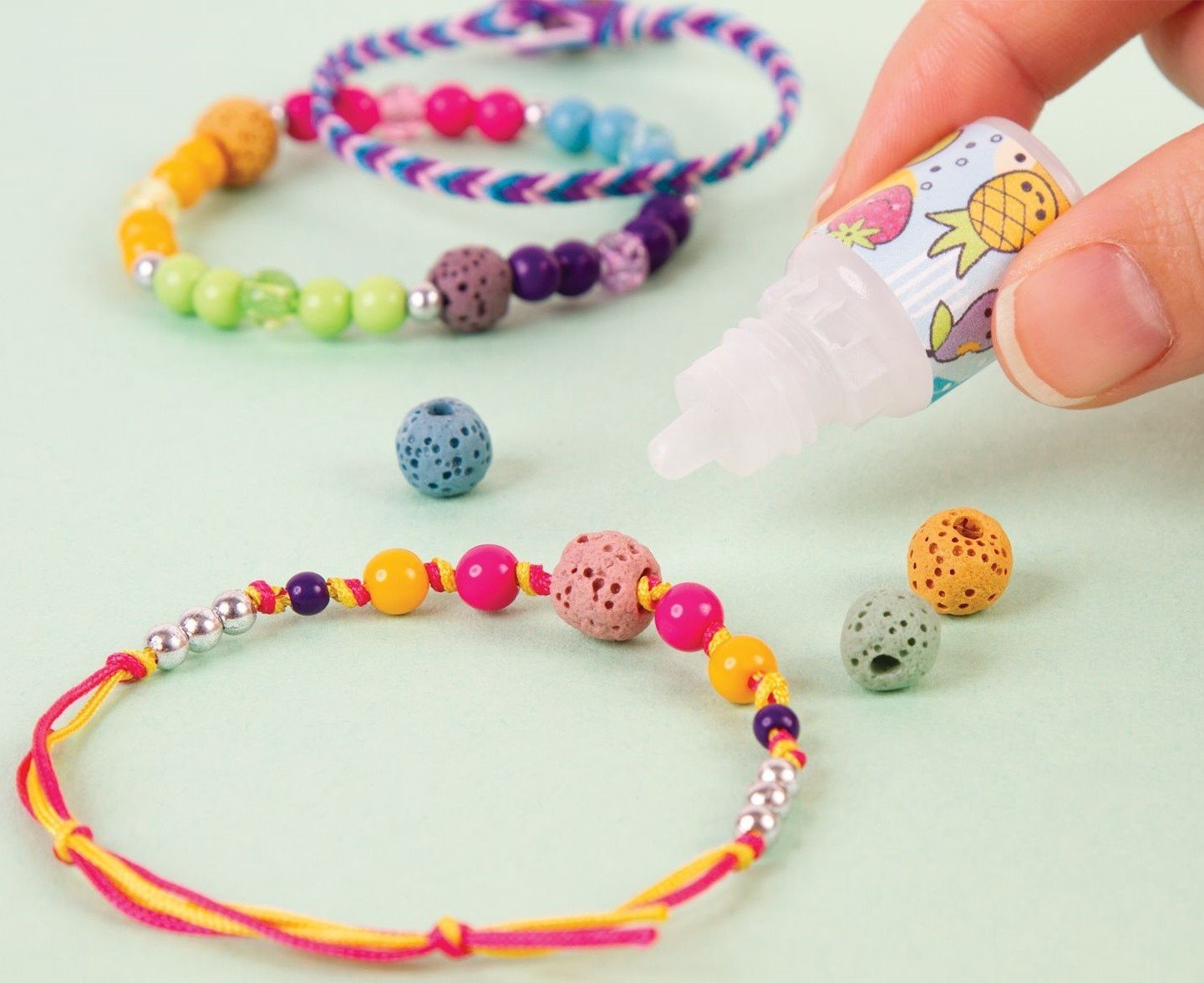 Vyrob si sadu voňavých náramkov, ktoré nikto iný nemá. Vytvor si originálne náramky s lávovými korálkami, napusť ich vonnou esenciou a okúzli svoje okolie. Pomocou sady na výrobu náramkov ti to pôjde jedna radosť. Spolu s kamarátkami vytvorte tie najkrajšie doplnky! Sada obsahuje: - 10 lávových korálikov - 1 fľaštičku ovocnej vône - 130 plastových korálikov - 3 prívesky - 6 farebných nylonových povrázkov (9 m) - priehľadný elastický povrázok (1 m) - plastový podnos na tvorenie náramkov - obrázkový návod Vhodné pre deti rokov.Vlastnosti
