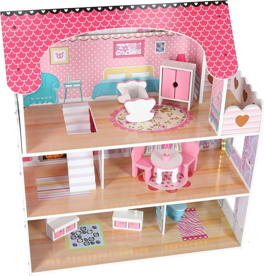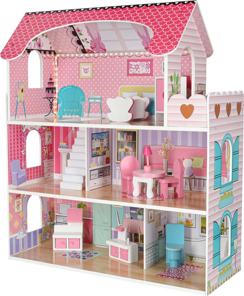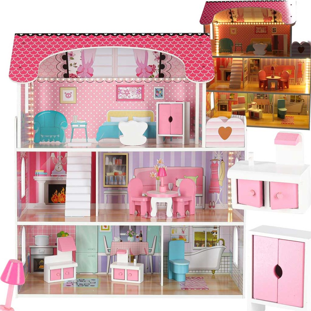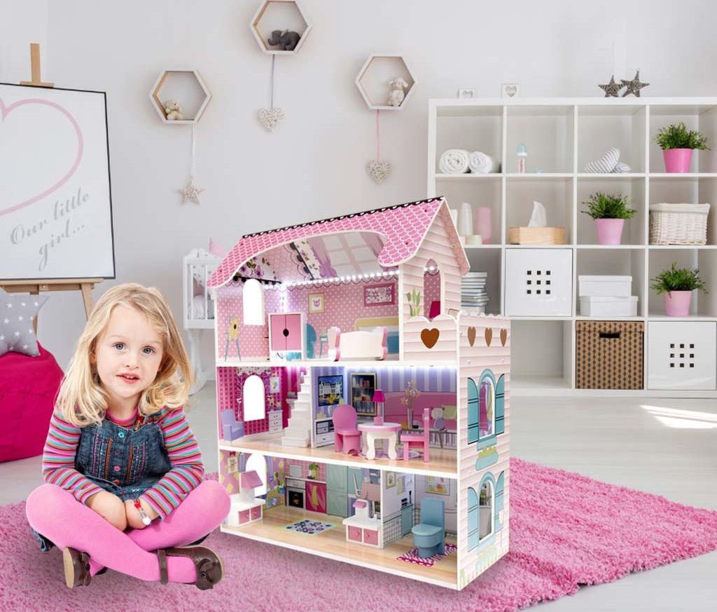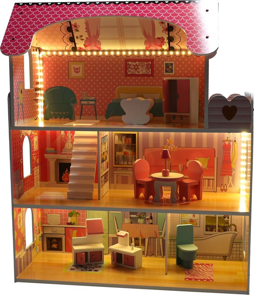 MDF drevený domček pre bábiky + nábytok 70cm ružový LED