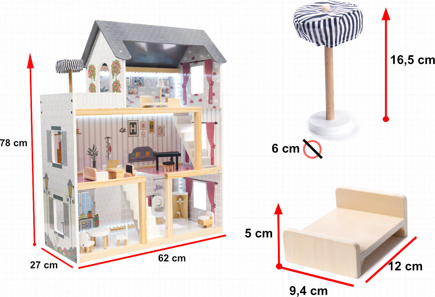 Ako sa na skutočný dom pristane, má výrazné LED osvetlenie, ktoré nielenže vyzerá fantasticky, ale skvele sa hodí aj ako nočná lampička. Veľké množstvo prvkov poskytuje možnosť nekonečného hrania. Kreatívna hračka, s ktorou nie je čas na nudu. Kvalita a precíznosť spracovania zaujme detaily. Miniatúrny nábytok, grafika na stenách a LED osvetlenie robia dom jedinečným a veľmi útulným.