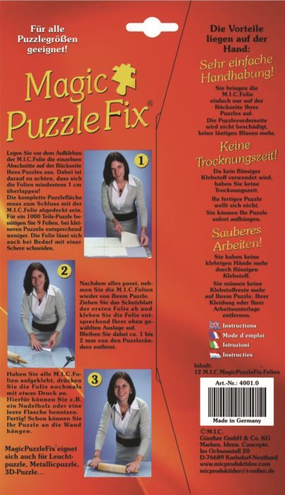 Už žiadne zasychanie - so samolepiacou fóliou na jednoduché a rýchle nalepenie puzzle jednoducho zarámujete zložený obrázok aj Vy! Výhody lepiacej fólie Magic PuzzleFix: - vďaka lepeniu z rubovej strany nie je vzhľad obrázku (predná strana) narušená a nevznikajú nevzhľadné bubliny - ihneď po nalepení je možné obrázok zavesiť (nie je potrebné čakať na zaschnutie ako u lepidla) - nehrozí ušpinenie od lepidla Výrobok obsahuje 12 listov fólia, každý s rozmerom 25 x 17,5 cm. Pre puzzle s 1000 dielikmi bude treba približne 9 hárkov. Návod na použitie: Zložené puzzle položte obrázkom dole a na jeho zadnú stranu si rozložte fólie Magic PuzzleFix tak, aby presahovali cez seba aspoň 1 cm. Fóliu je možné strihať nožnicami, avšak vždy ponechajte 1-2mm na okraji obrázku. Akonáhle je pokrytý celý obrázok, postupne odlepte z hárkov fólie kryciu vrstvu a nalepte ju na vybrané miesto. Po aplikácii všetkých lepiacich fólií ich pevne pritlačte, prípadne na tento účel použite valček na cesto alebo prázdnu fľašu.Vlastnosti
