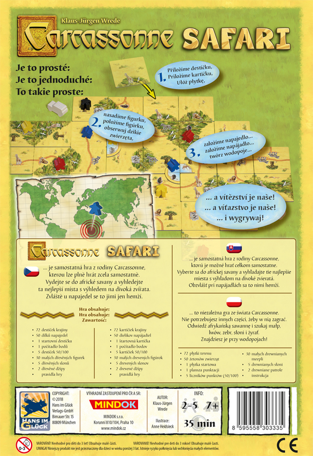 Taktická spoločenská hra, ktorá s každým ťahom prináša nové možnosti. Carcassonne: Safari je samostatná hra z rodiny Carcassonne, ktorú je možné plne hrať úplne samostatne. Vydajte sa do africkej savany a vyhľadajte tie najlepšie miesta s výhľadom na divé zvieratá. Zvlášť u napájadiel sa to nimi len tak hemží.