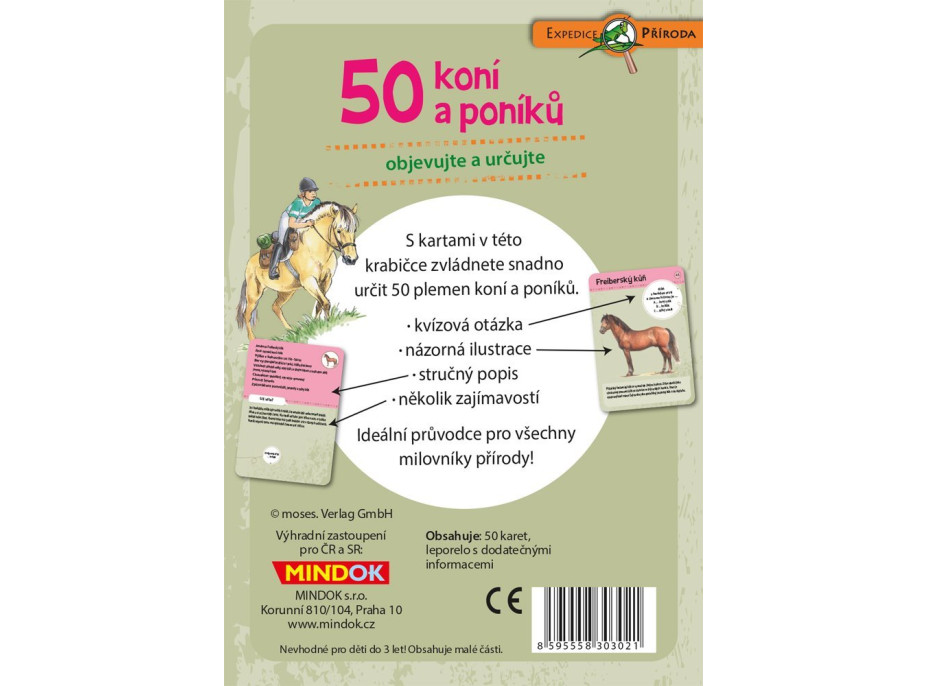Vďaka kartám v tejto krabičke zvládnete hravo určiť 50 plemien koní a poníkov. Na kartách nájdete kvízovú otázku, názornú ilustráciu, základné informácie a tiež niekoľko zaujímavostí. Ideálny sprievodca pre všetkých milovníkov prírody! Balenie obsahuje: 50 kariet, leporelo s dodatočnými informáciami.Vlastnosti