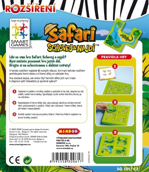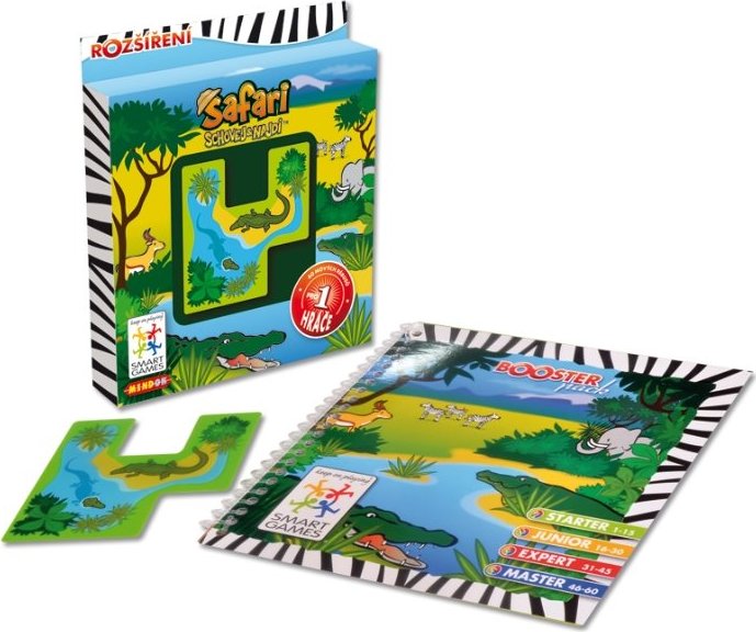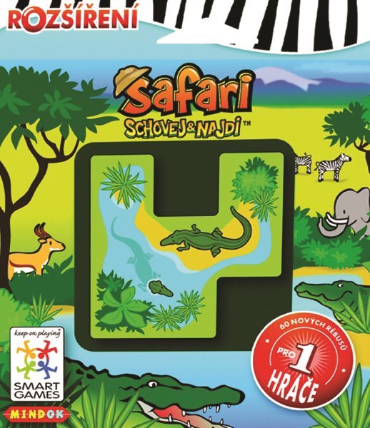 Hrateľné iba so základným vydaním hry Safari! Zahrajte sa na schovávačku so zvieratami na safari! V tejto logickej hre môžete riadne precvičiť svoje mozgové bunky. Na to aby ste prešli divočinou všetkých rébusov, budete potrebovať logické myslenie a dobrú priestorovú predstavivosť. Zadanie obsahuje 60 rôzne náročných úloh. Hra Safari rozšírenie, patrí do skupiny viacúrovňových, logických hier Smart games, ktoré sú určené predovšetkým pre jedného hráča (avšak hru môže hrať aj hráčov viac). Logické hry Smart Games obsahujú vždy zadanie v niekoľkých rôznych stupňoch obtiažnosti, rozvíja IQ, logické myslenie, priestorovú predstavivosť, koncentráciu a plánovanie. Pravidlá hry: Vyberte si zadanie z knižky zadania a položte ho tak, aby ste naň videli, vedľa hracej dosky. Spočítajte, koľko zvierat ktorého druhu je na obrázku. Naskladajte 4 herné dieliky tak, aby zakryli všetky zvieratá okrem tých zobrazených v zadaní. Vždy vám zostane 1 herný dielik. ktorý pri riešení nepoužijete! Každé zadanie má iba jedno riešenie. Všetky riešenia sú vyobrazené na konci knižky zadania. Hra obsahuje: 60 rébusov, pravidlá hryVlastnosti