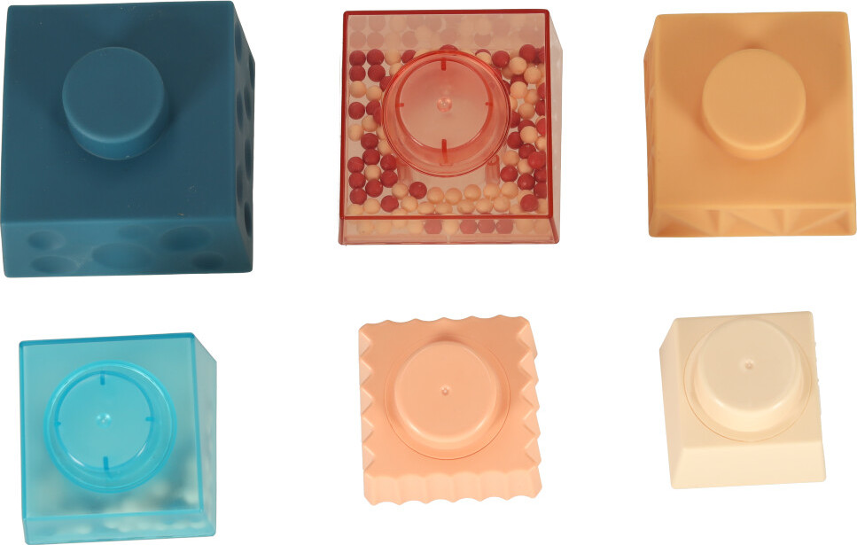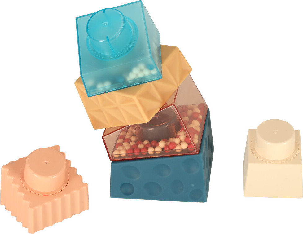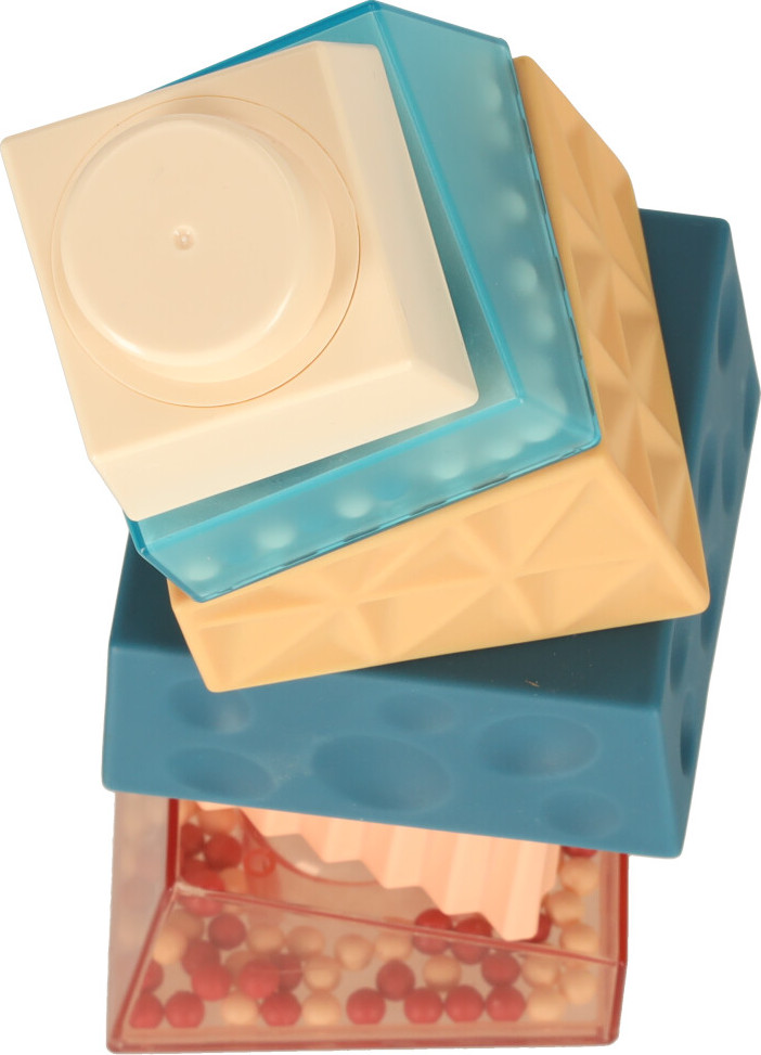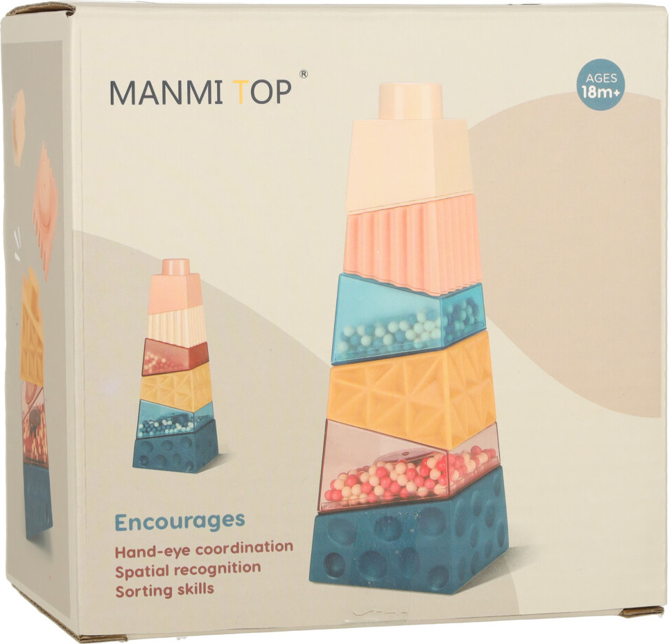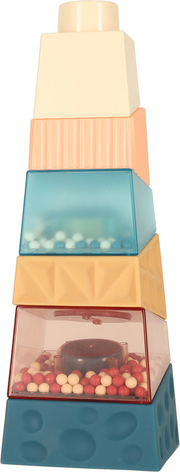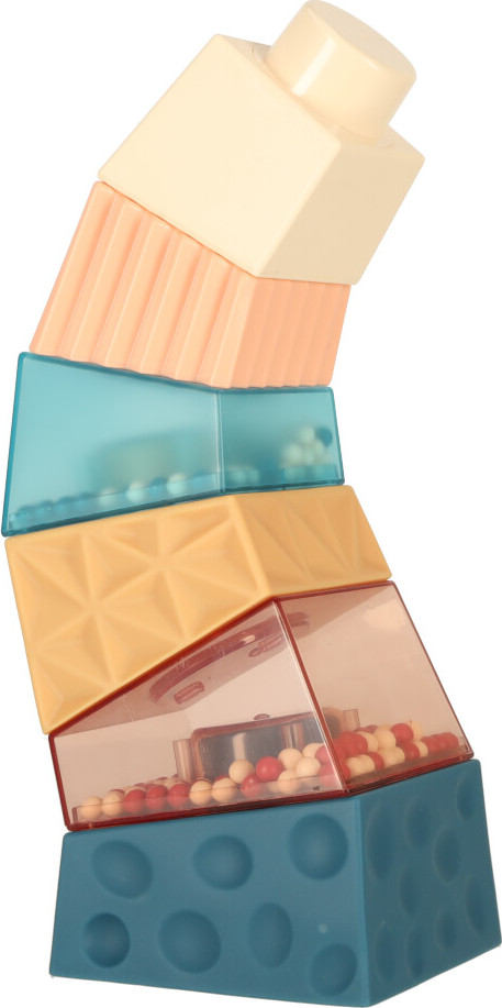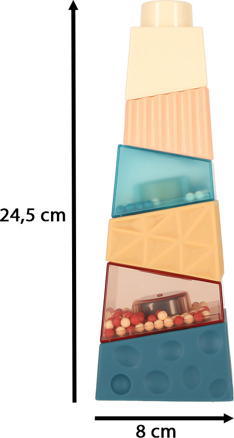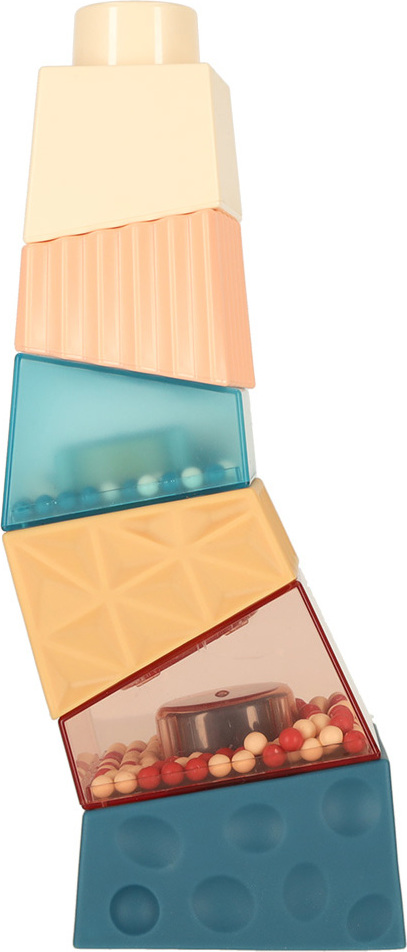 Každý blok je iný - dva bloky majú uprostred guličky, ktoré sa počas hry sypú, a ostatné bloky majú rôzne textúry. Vďaka rozmanitým farbám a textúram bude hračka vynikajúcim vizuálnym a hmatovým trenažérom. Pri hre s vežou bude dieťa rozvíjať svoje kognitívne schopnosti a spoznávať úskalia stavby. Precvičia si aj manuálne zručnosti, ako je presnosť ruky alebo koordinácia oko-ruka. Kocky je možné ľubovoľne skladať na seba, to však neznamená, že veža udrží každú vytvorenú kombináciu! Úlohou batoľaťa je poskladať kocky tak, aby veža nespadla – to bude od malého génia vyžadovať veľa premýšľania a presnosti. Vytvorenie stabilnej veže dodá vášmu dieťaťu pocit úspechu! Vďaka tomu, že každý blok je veľký, je sada bezpečná pre hru detí starších ako 18 mesiacov . Jedinečný dizajn hračky bude krásne vyzerať aj na poličke ako dekorácia do detskej izby.