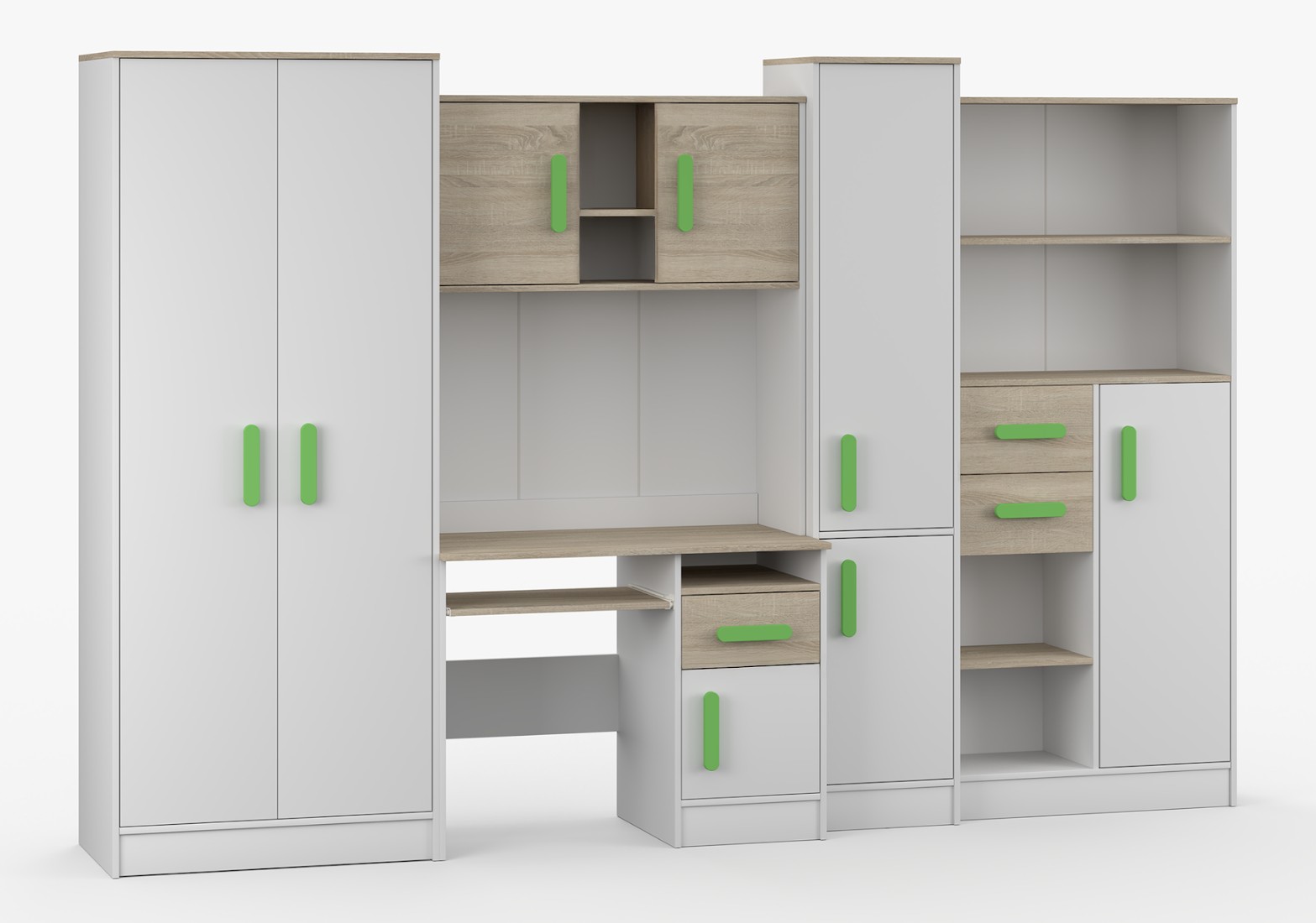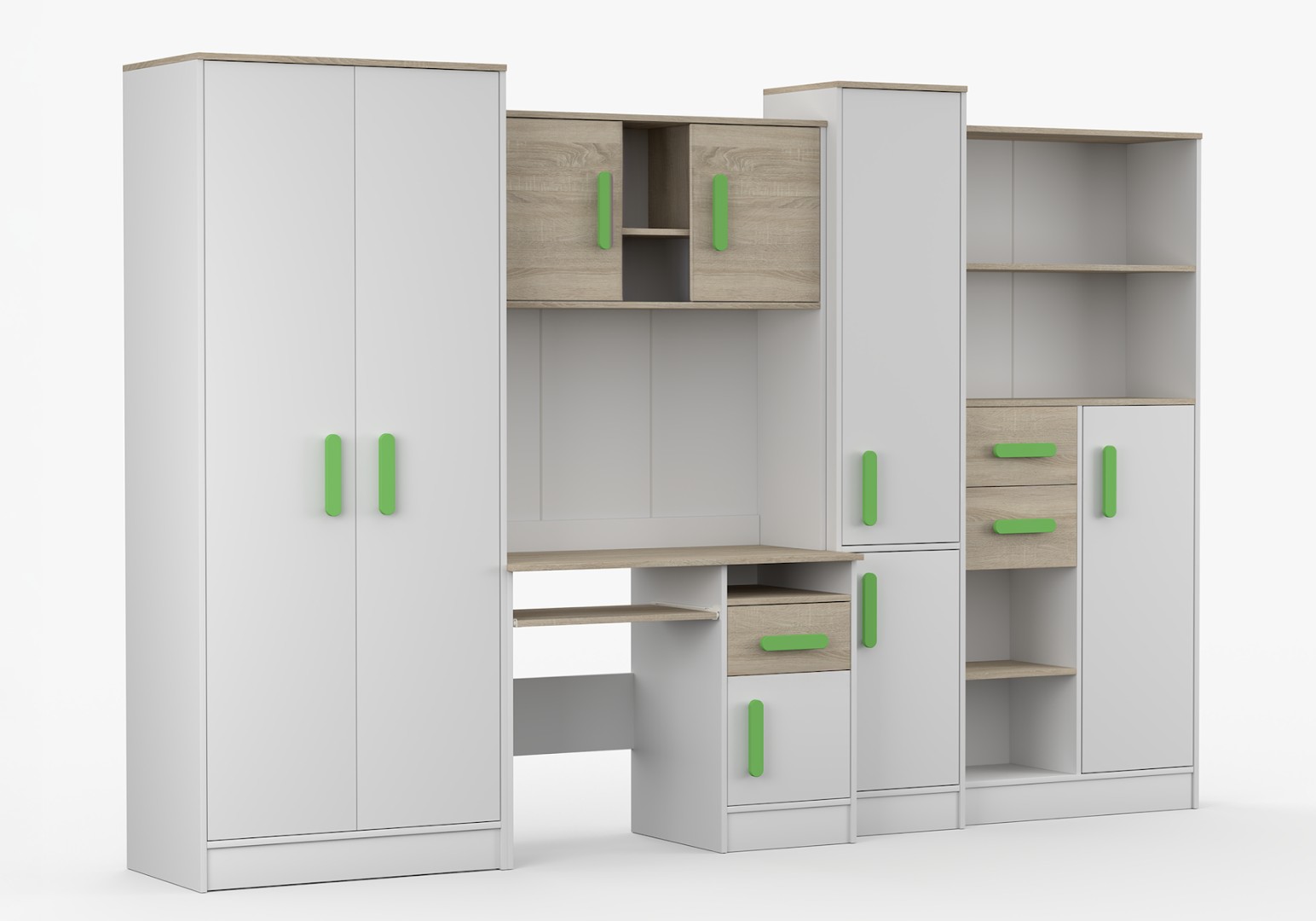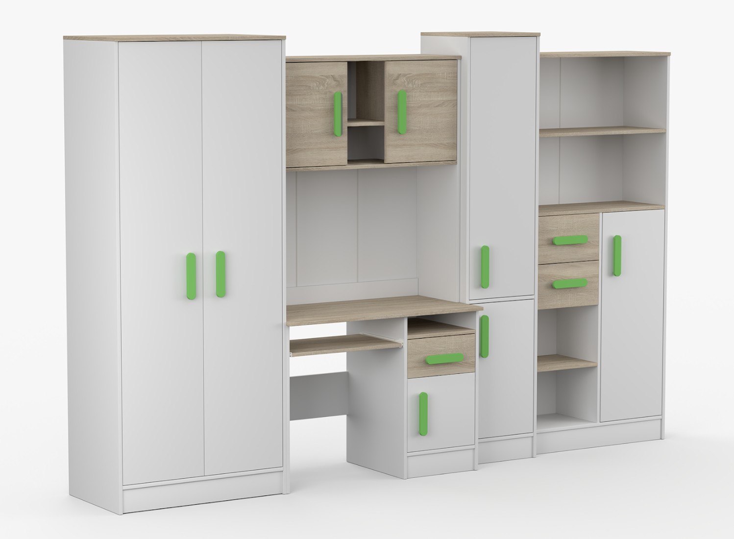 Nábytková stena SCOUT je sada zložená z piatich prvkov, ktoré sú nevyhnutné v každej detskej izbe alebo izbe pre študenta. Najdôležitejším prvkom je písací stôl, ktorý je vybavený priestrannou skrinkou a šuplíkom. Má vysúvaciu policu pre klávesnicu a otvorenú policu na drobné príslušenstvo. Na písacom stole je nadstavec rozdelený na časť s otvorenými policami a dve uzavreté skrinky. Súčasťou zostavy je aj dvojdverová skriňa. Vnútri skrine nájdeme policu a tyč na zavesenie odevov. Ďalšími prvkami sú dva regály vybavené zásuvkami a skrinkami – jeden uzavretý a druhý s otvorenými policami ktorý poskytuje dostatok úložného priestoru pre knihy, hračky a dekorácie. Zostava nemá dosku medzi písacím stolom a hornou skrinkou.