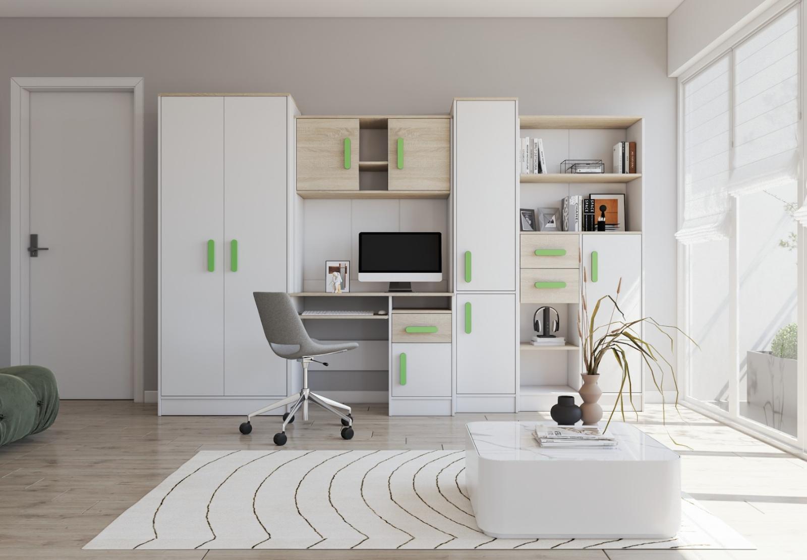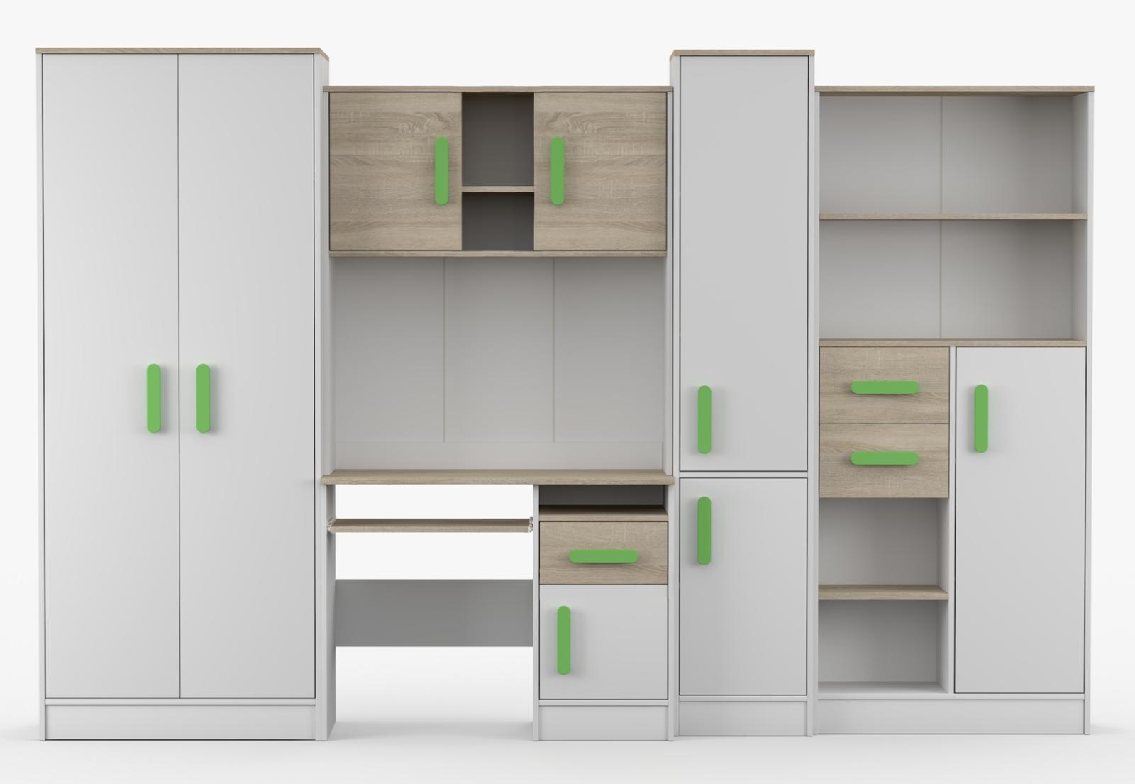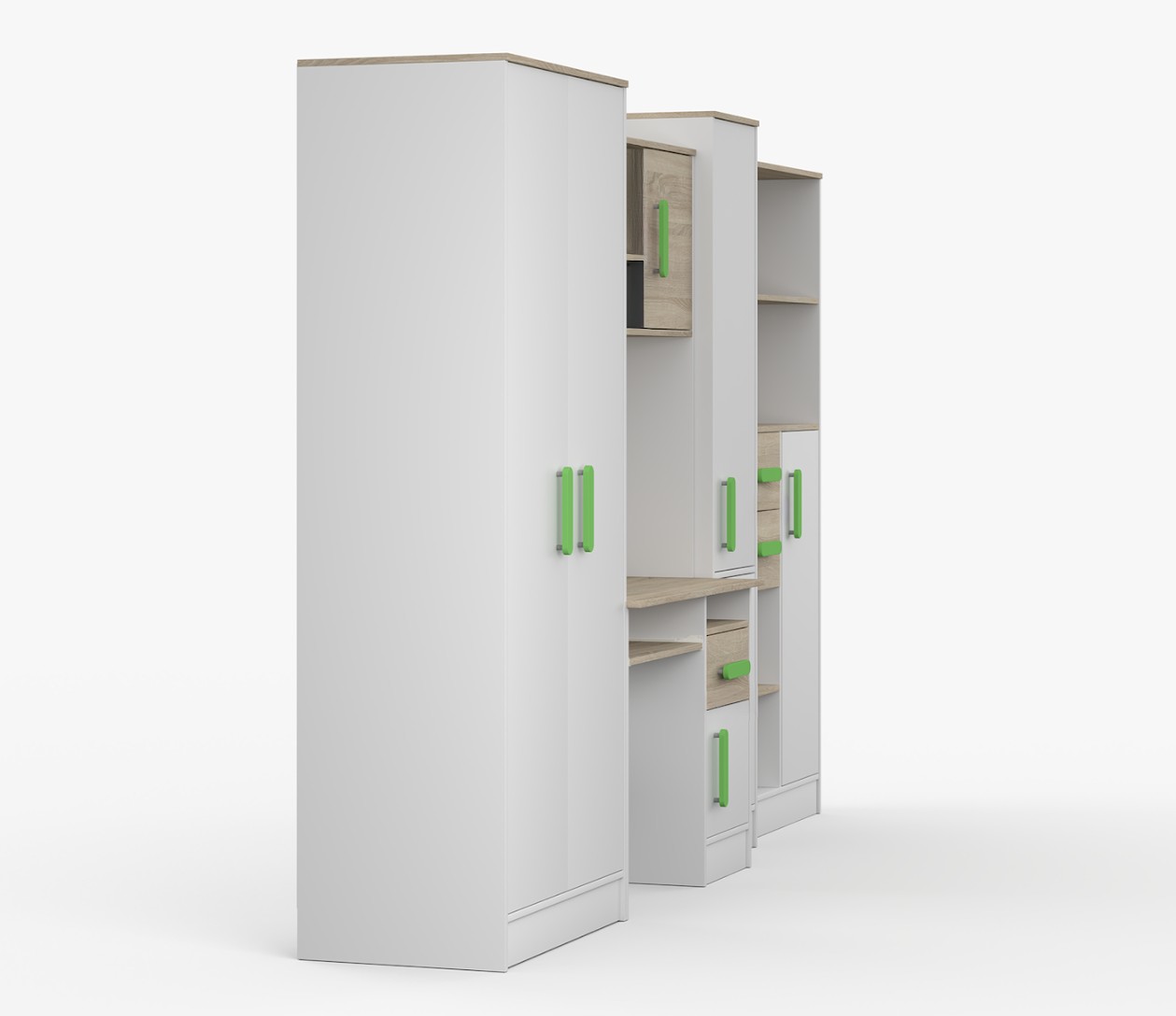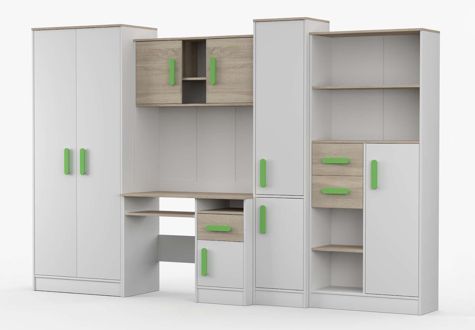 Nábytková stena SCOUT je sada zložená z piatich prvkov, ktoré sú nevyhnutné v každej detskej izbe alebo izbe pre študenta. Najdôležitejším prvkom je písací stôl, ktorý je vybavený priestrannou skrinkou a šuplíkom. Má vysúvaciu policu pre klávesnicu a otvorenú policu na drobné príslušenstvo. Na písacom stole je nadstavec rozdelený na časť s otvorenými policami a dve uzavreté skrinky. Súčasťou zostavy je aj dvojdverová skriňa. Vnútri skrine nájdeme policu a tyč na zavesenie odevov. Ďalšími prvkami sú dva regály vybavené zásuvkami a skrinkami – jeden uzavretý a druhý s otvorenými policami ktorý poskytuje dostatok úložného priestoru pre knihy, hračky a dekorácie. Zostava nemá dosku medzi písacím stolom a hornou skrinkou.