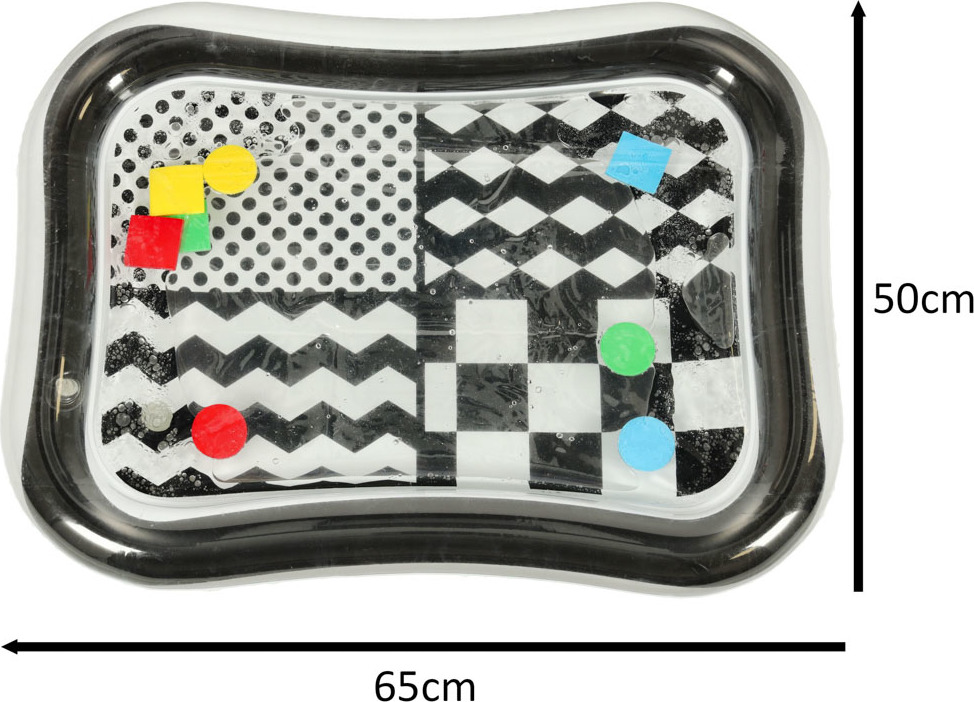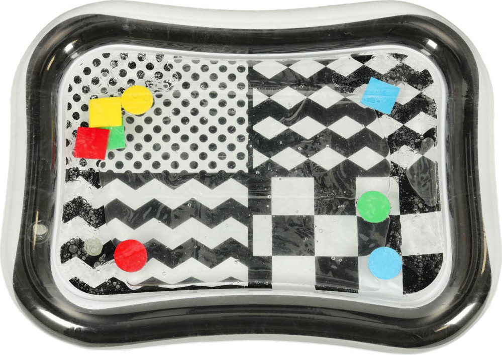 Úžasná senzorická podložka pre deti s kontrastným čiernobielym vzorom. Vnútri podložky sú umiestnené farebné geometrické obrazce, ktoré sa pri pohybe dieťaťa pohybujú. Plávajúce prvky upútajú záujem dieťaťa a zamerajú jeho pozornosť. Pri ležaní na brušku si dieťa precvičuje svaly, ktoré sú zodpovedné za správne držanie tela. Senzorická podložka sa veľmi ľahko používa. Okraj podložky nafúknite vzduchom a stred naplňte vodou. Pre lepší efekt je možné stred naplniť čiastočne vodou a čiastočne vzduchom.