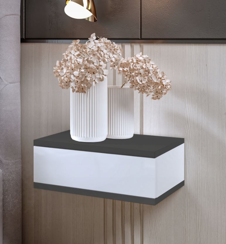 Závesný nočný stolík LOFT dokonale splní svoju rolu praktického kusu nábytku, ale taktiež dodá vášmu priestoru jedinečné kúzlo. Nočný stolík je vyrobený z najkvalitnejšej nábytkovej dosky s hrúbkou 16 mm. Hrany sú zakončené PVC. Vďaka tomu je stolík pevný, odolný a univerzálny. Stolík má jednu zásuvku, ktorá poskytuje dostatok priestoru na uloženie kníh alebo predmetov, ktoré tak budete mať na dosah ruky. Otváranie šuplíka je vďaka systému push-to-open veľmi praktické a jednoduché. Vďaka elegantnému závesnému dizajnu pôsobí stolík veľmi minimalistickým a funkčným dojmom.