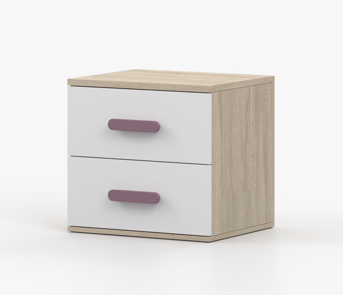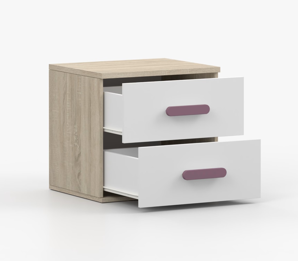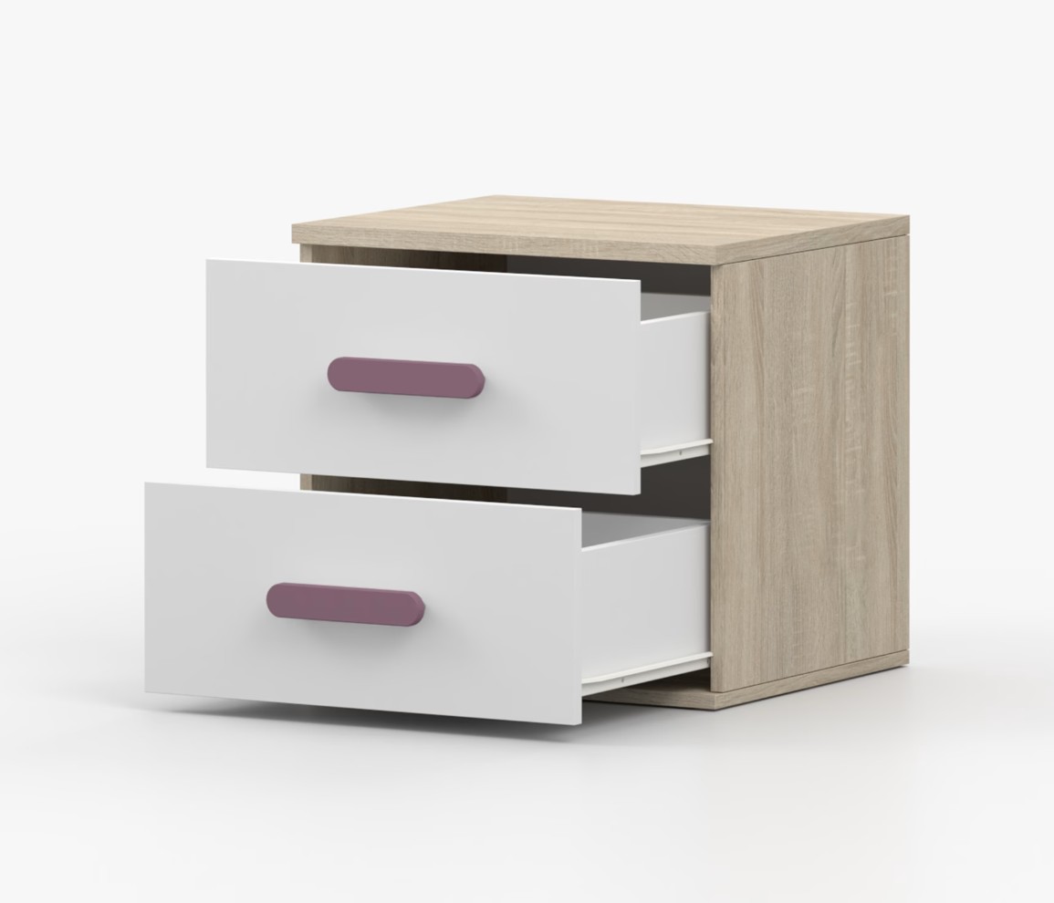 Nočný stolík SCOUT je moderný a praktický kus nábytku, vyrobený z kvalitnej 16mm laminovanej dosky v dekore duba sonoma. Stolík má hrany ohranené odolnou ABS hranou, ktorá ich chráni pred mechanickým poškodením. Je vybavený dvoma priestrannými zásuvkami s drevenými farebnými úchytkami. Jeho nadčasový dizajn sa hodí do rôznych typov interiérov, napríklad do detskej izby alebo izby pre študenta.