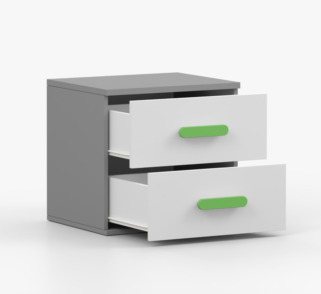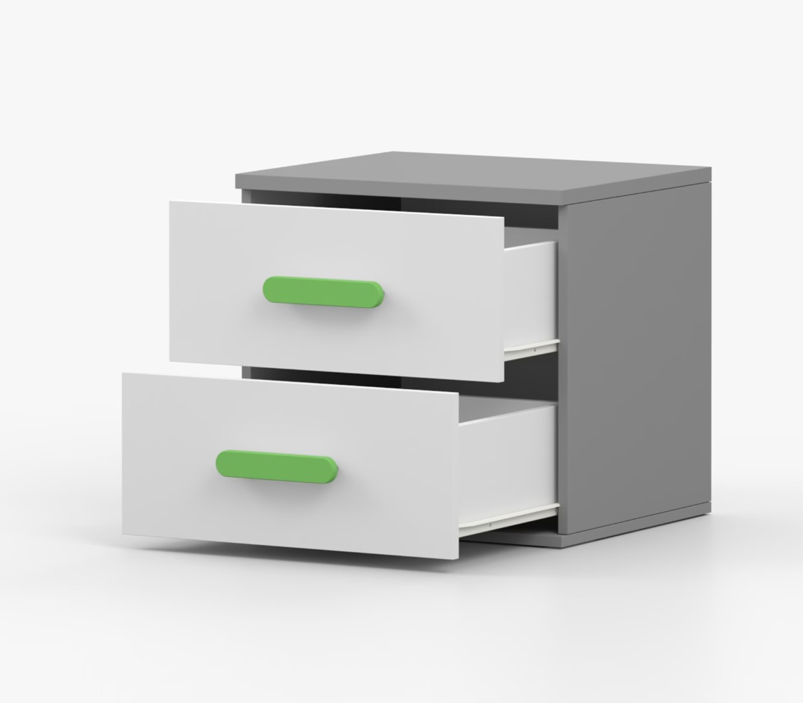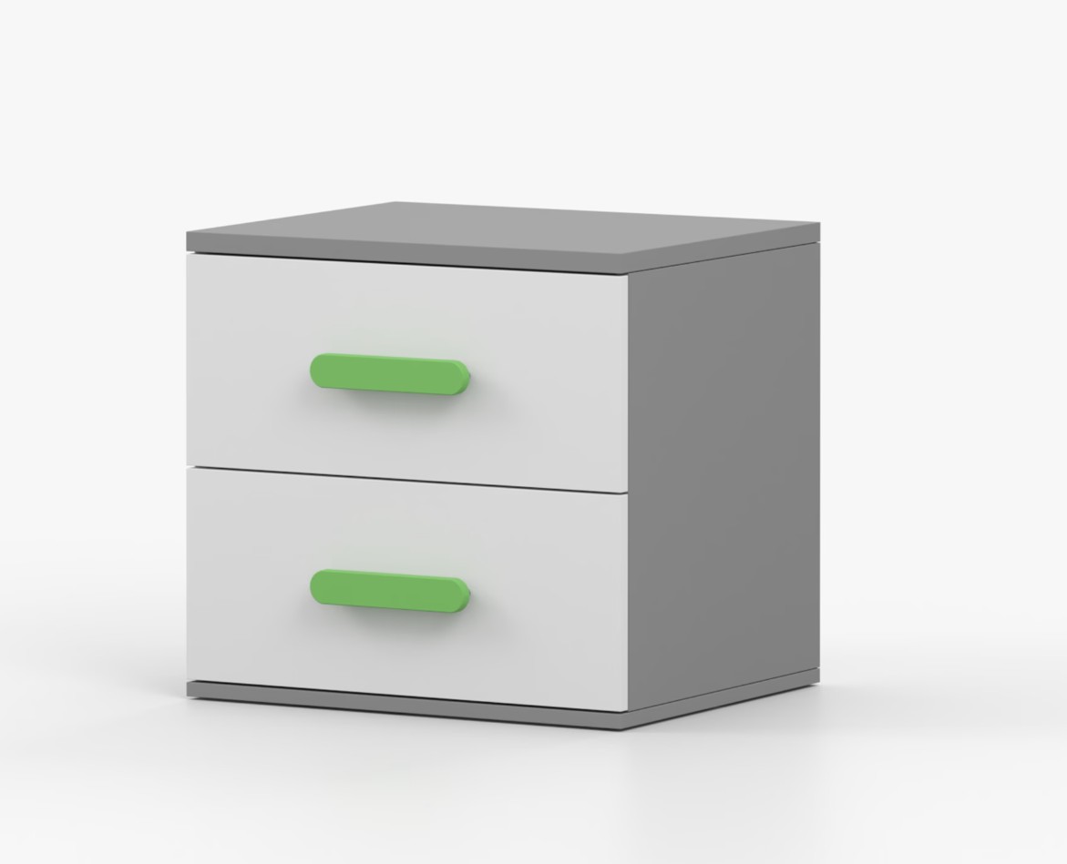Nočný stolík SCOUT je moderný a praktický kus nábytku, vyrobený z kvalitnej 16mm laminovanej dosky v šedom odtieni. Hrany sú ohranené odolnou ABS lištou, ktorá ich chráni pred mechanickým poškodením. Stolík má dve priestranné zásuvky s drevenými farebnými úchytkami. Jeho nadčasový dizajn sa hodí do rôznych typov interiérov, napríklad do detskej izby alebo izby pre študenta.