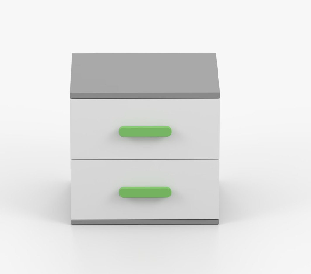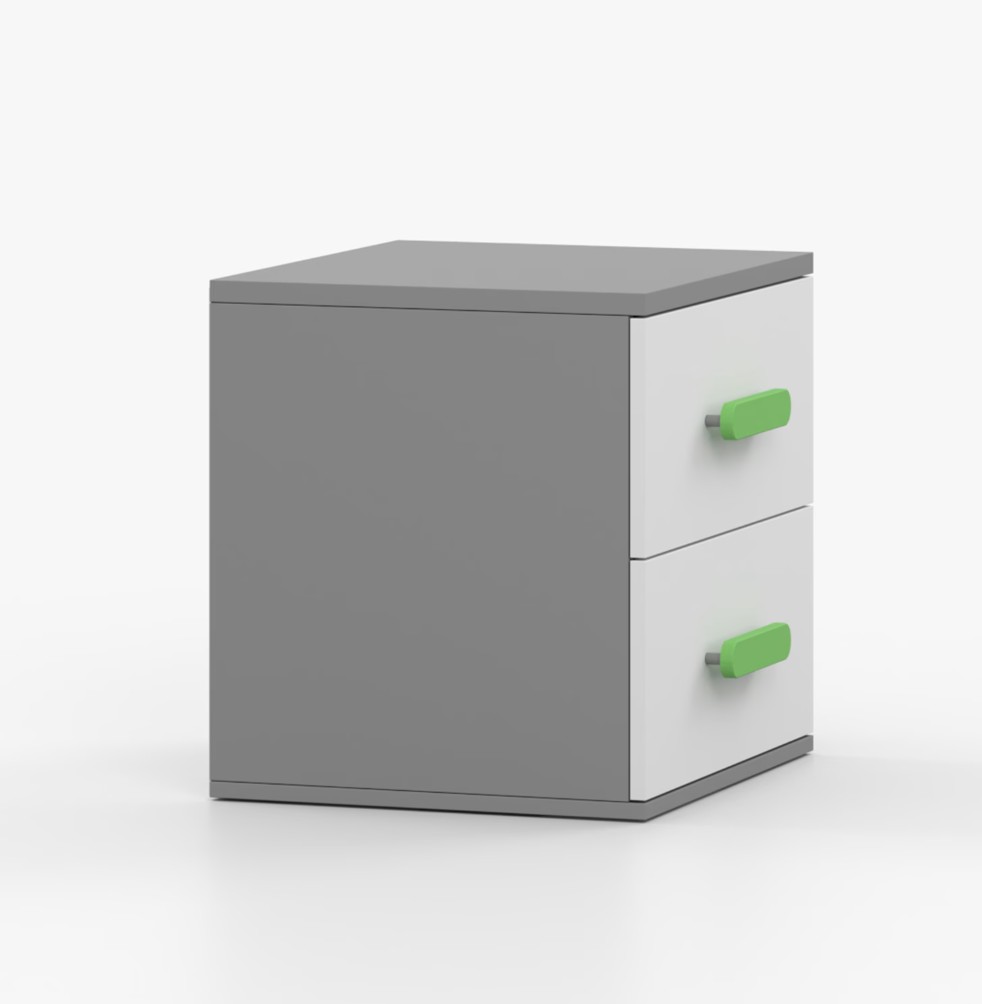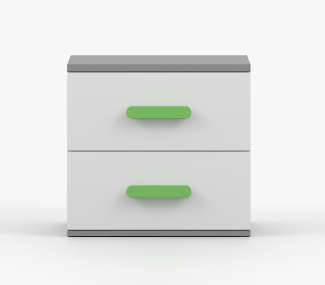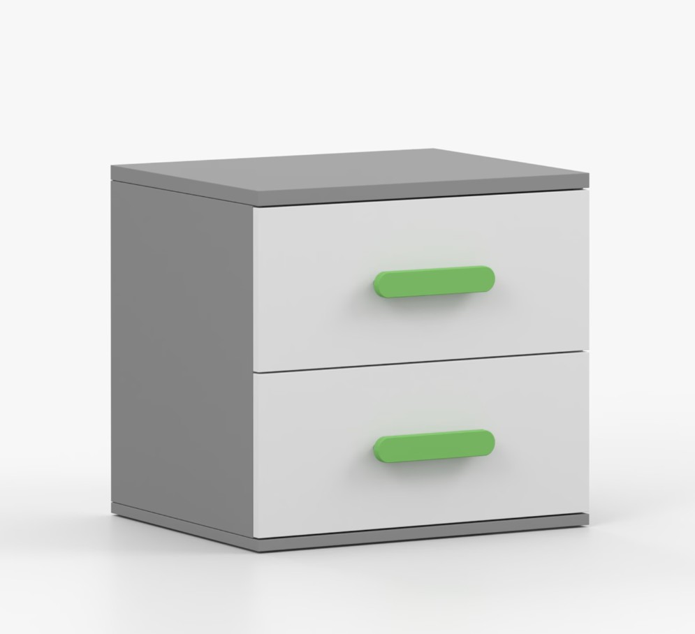 Nočný stolík SCOUT je moderný a praktický kus nábytku, vyrobený z kvalitnej 16mm laminovanej dosky v šedom odtieni. Hrany sú ohranené odolnou ABS lištou, ktorá ich chráni pred mechanickým poškodením. Stolík má dve priestranné zásuvky s drevenými farebnými úchytkami. Jeho nadčasový dizajn sa hodí do rôznych typov interiérov, napríklad do detskej izby alebo izby pre študenta.
