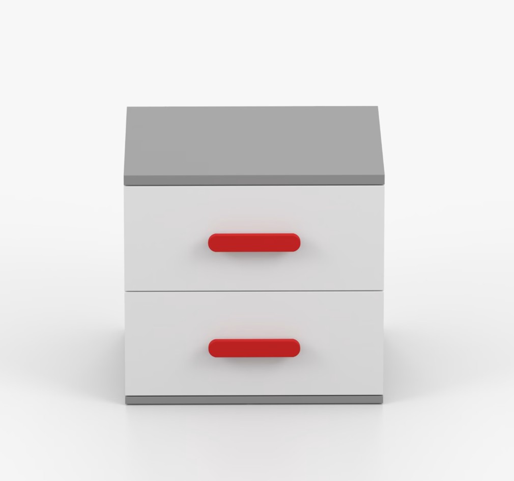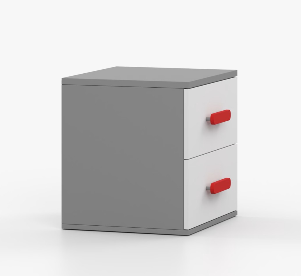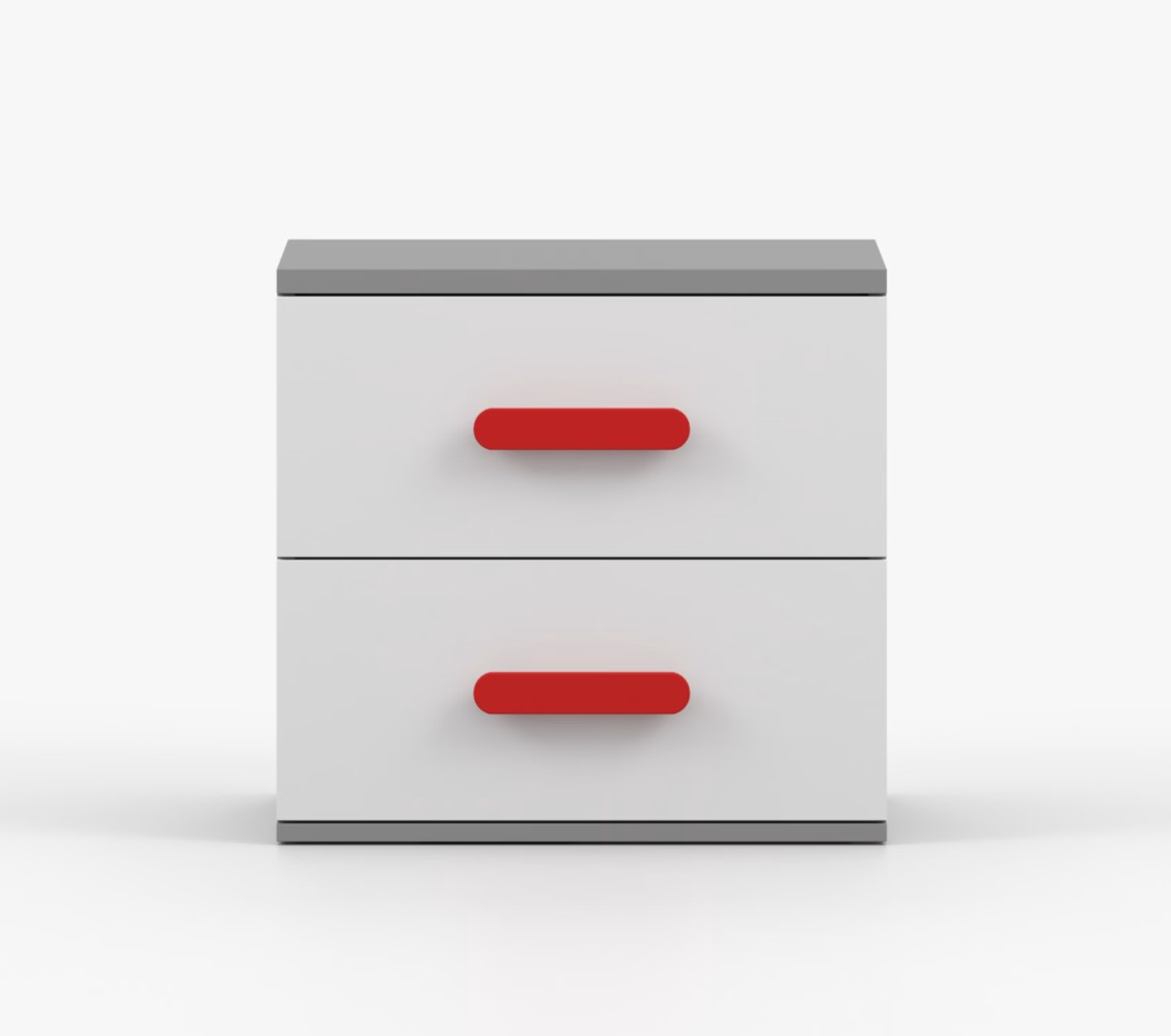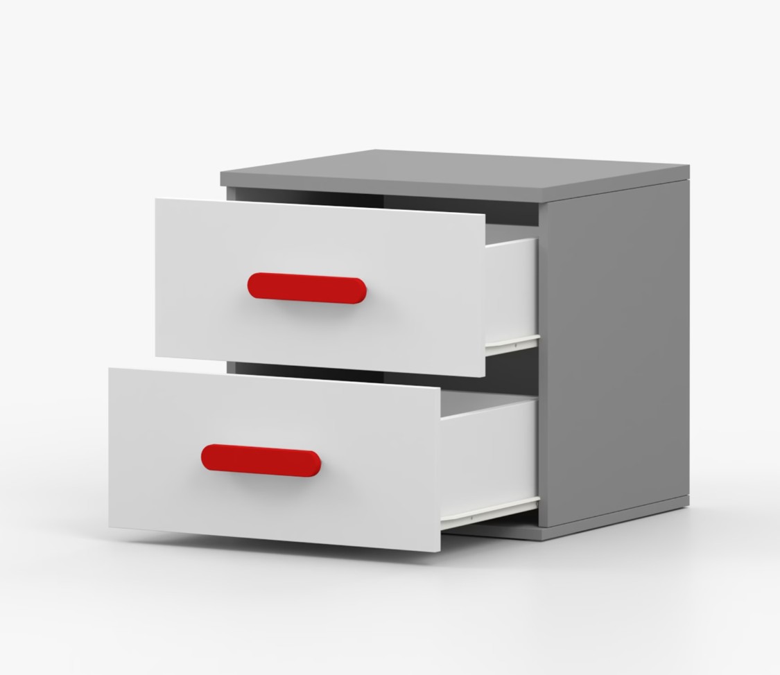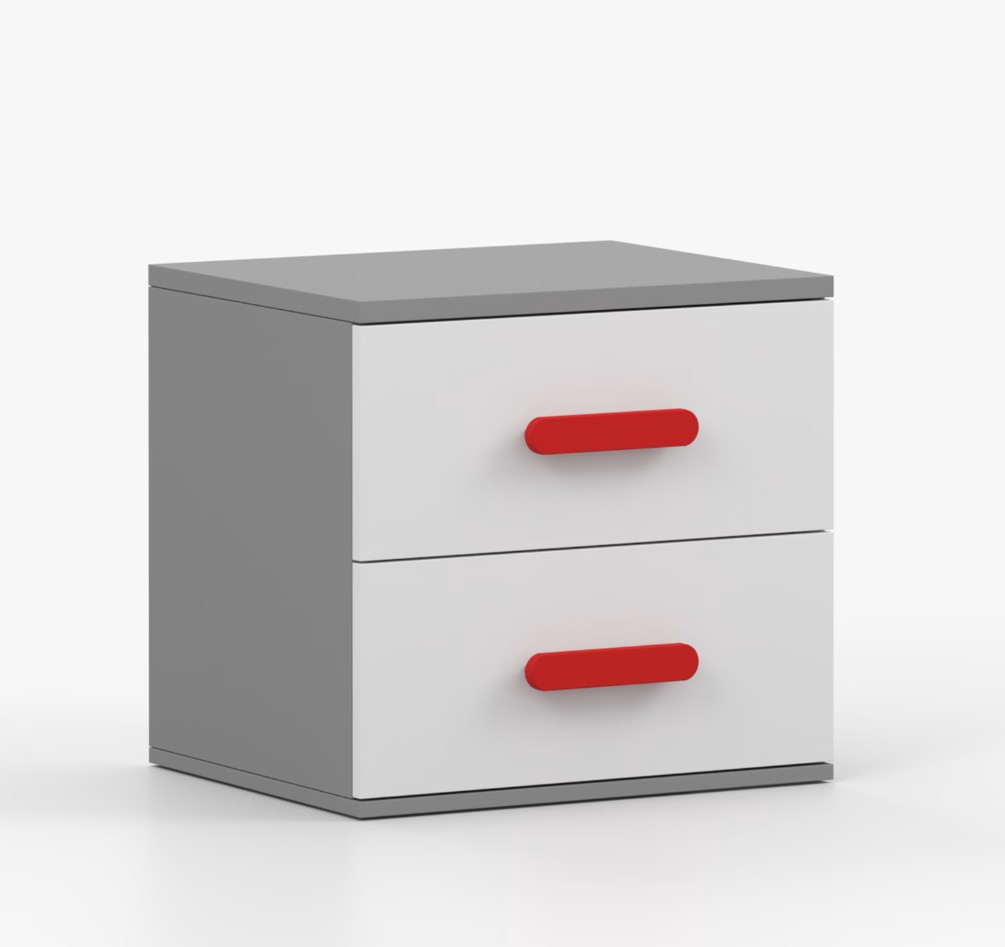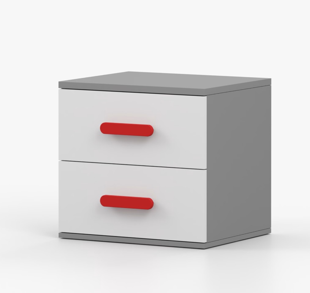 Nočný stolík SCOUT je moderný a praktický kus nábytku, vyrobený z kvalitnej 16mm laminovanej dosky v šedom odtieni. Hrany sú ohranené odolnou ABS lištou, ktorá ich chráni pred mechanickým poškodením. Stolík má dve priestranné zásuvky s drevenými farebnými úchytkami. Jeho nadčasový dizajn sa hodí do rôznych typov interiérov, napríklad do detskej izby alebo izby pre študenta.