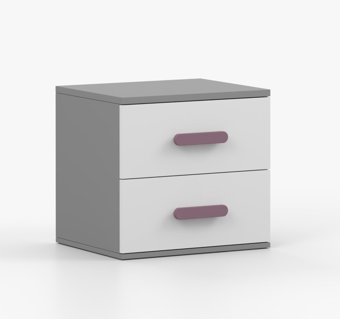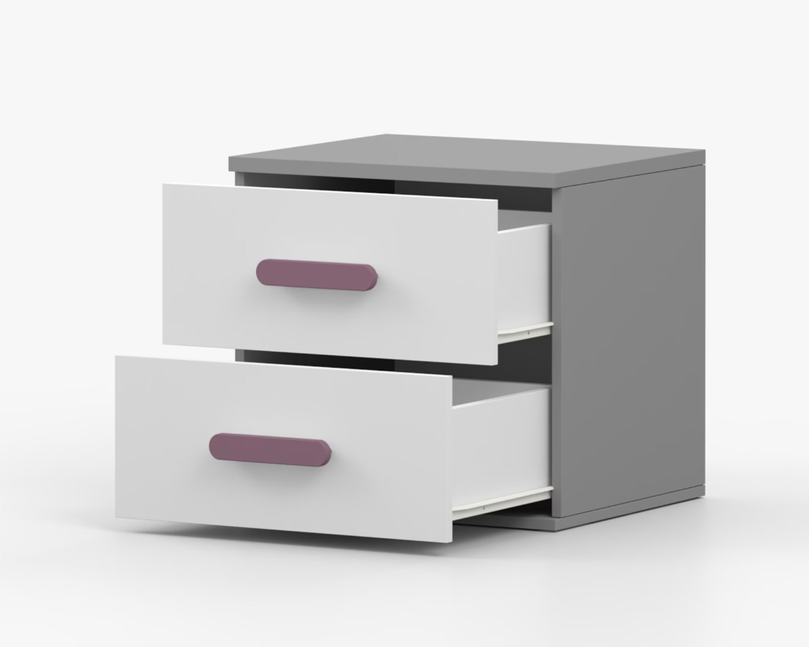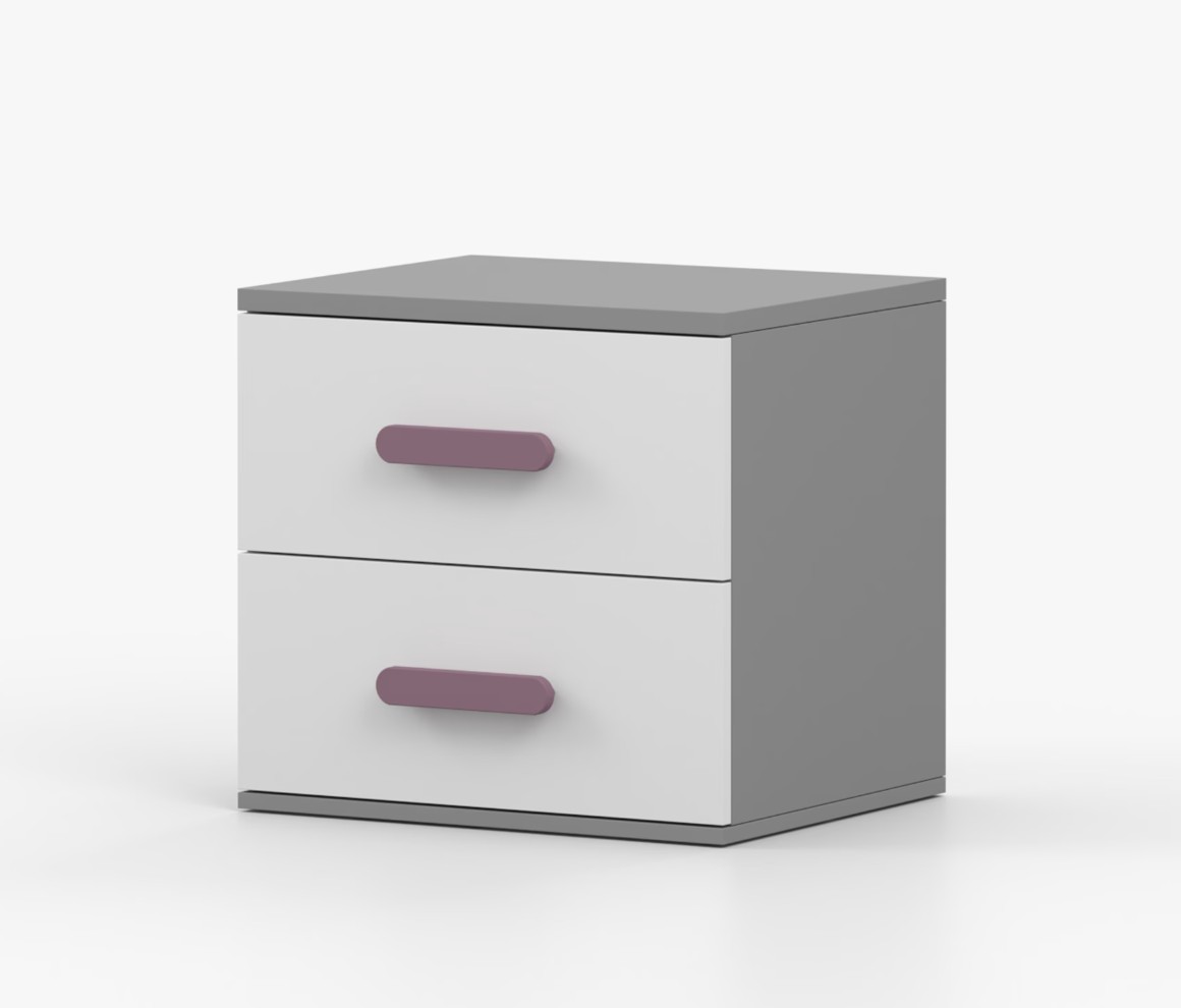 Nočný stolík SCOUT je moderný a praktický kus nábytku, vyrobený z kvalitnej 16mm laminovanej dosky v šedom odtieni. Hrany sú ohranené odolnou ABS lištou, ktorá ich chráni pred mechanickým poškodením. Stolík má dve priestranné zásuvky s drevenými farebnými úchytkami. Jeho nadčasový dizajn sa hodí do rôznych typov interiérov, napríklad do detskej izby alebo izby pre študenta.