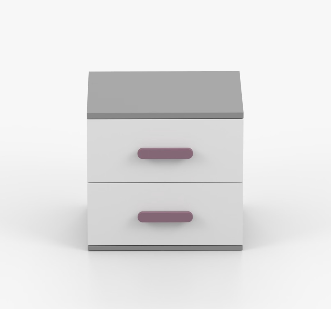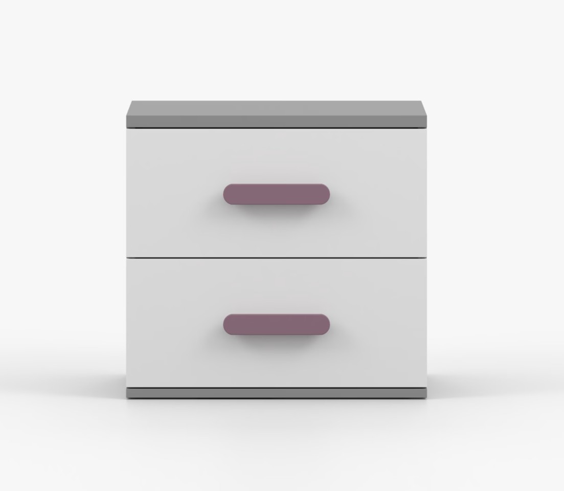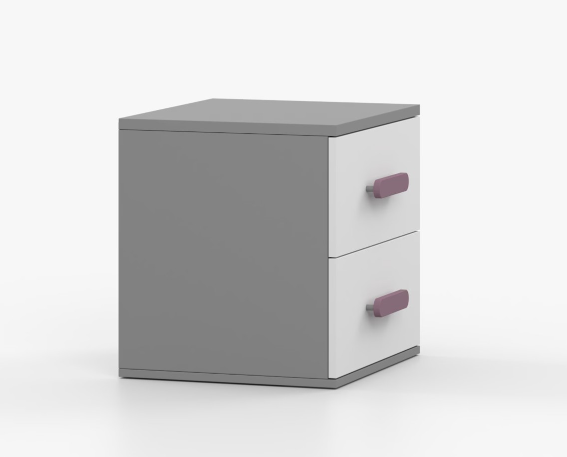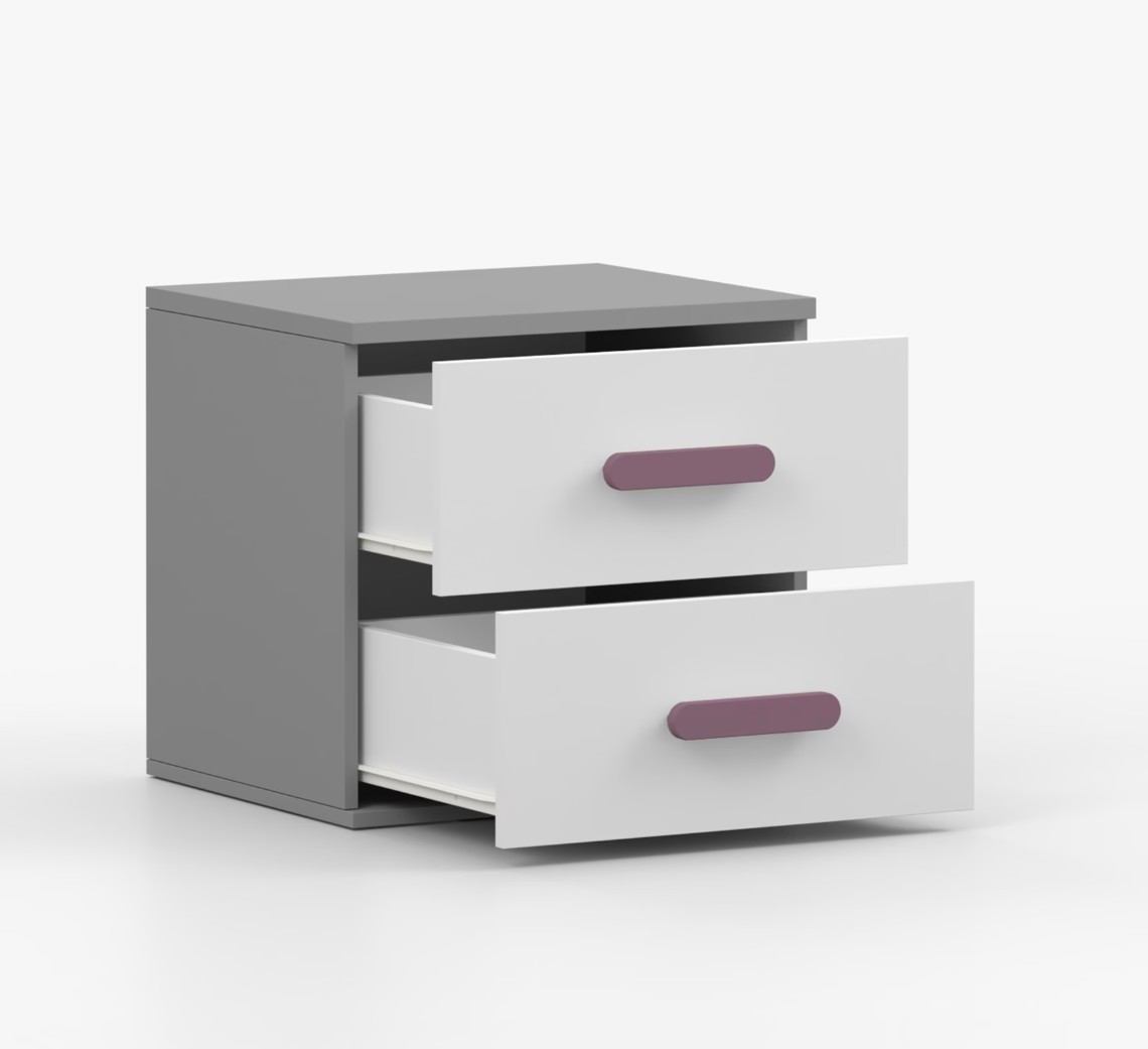 Nočný stolík SCOUT je moderný a praktický kus nábytku, vyrobený z kvalitnej 16mm laminovanej dosky v šedom odtieni. Hrany sú ohranené odolnou ABS lištou, ktorá ich chráni pred mechanickým poškodením. Stolík má dve priestranné zásuvky s drevenými farebnými úchytkami. Jeho nadčasový dizajn sa hodí do rôznych typov interiérov, napríklad do detskej izby alebo izby pre študenta.