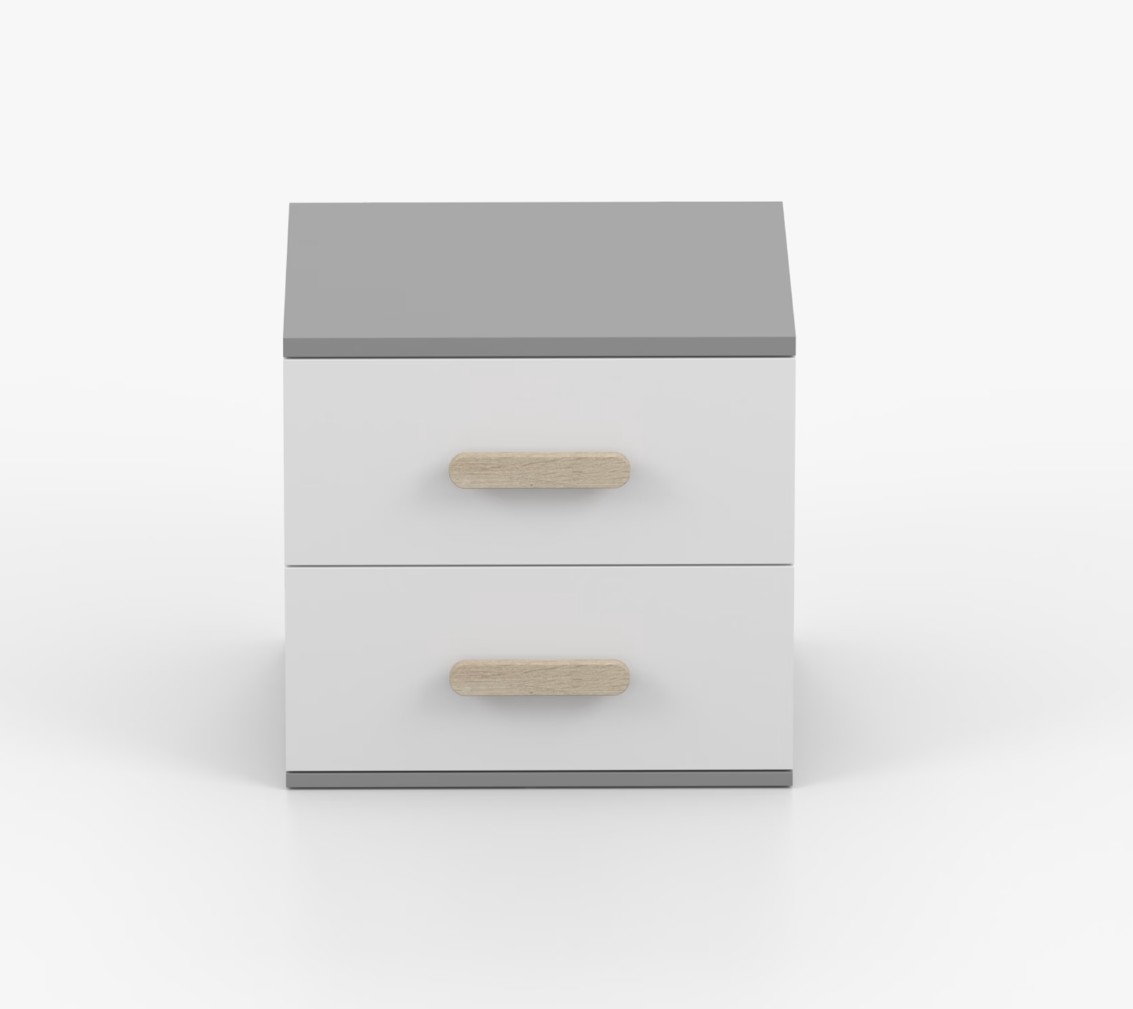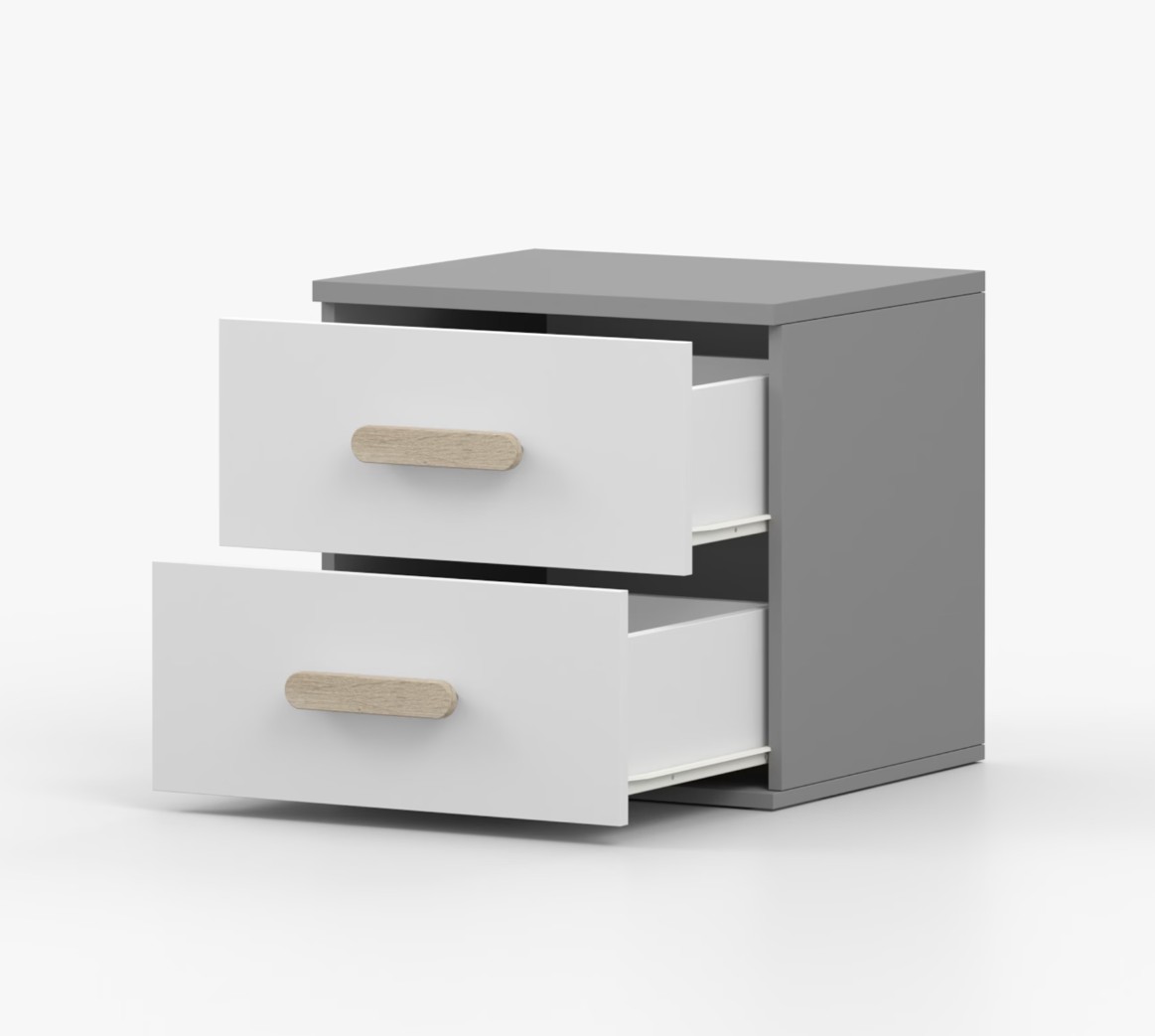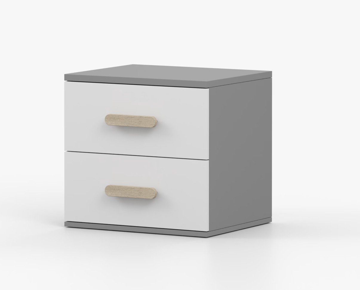 Nočný stolík SCOUT je moderný a praktický kus nábytku, vyrobený z kvalitnej 16mm laminovanej dosky v šedom odtieni. Hrany sú ohranené odolnou ABS lištou, ktorá ich chráni pred mechanickým poškodením. Stolík má dve priestranné zásuvky s drevenými farebnými úchytkami. Jeho nadčasový dizajn sa hodí do rôznych typov interiérov, napríklad do detskej izby alebo izby pre študenta.