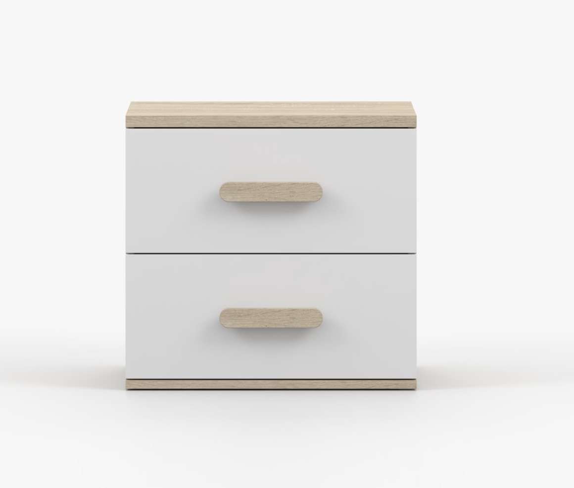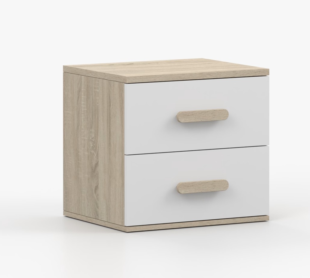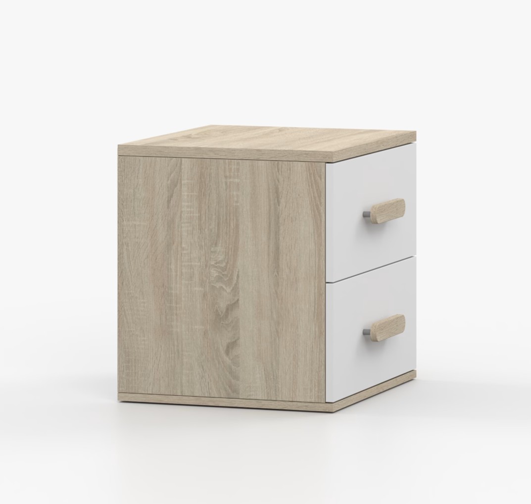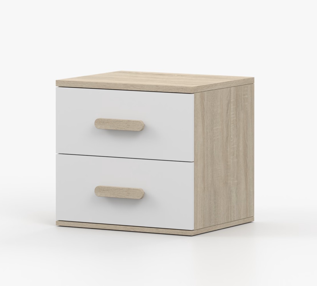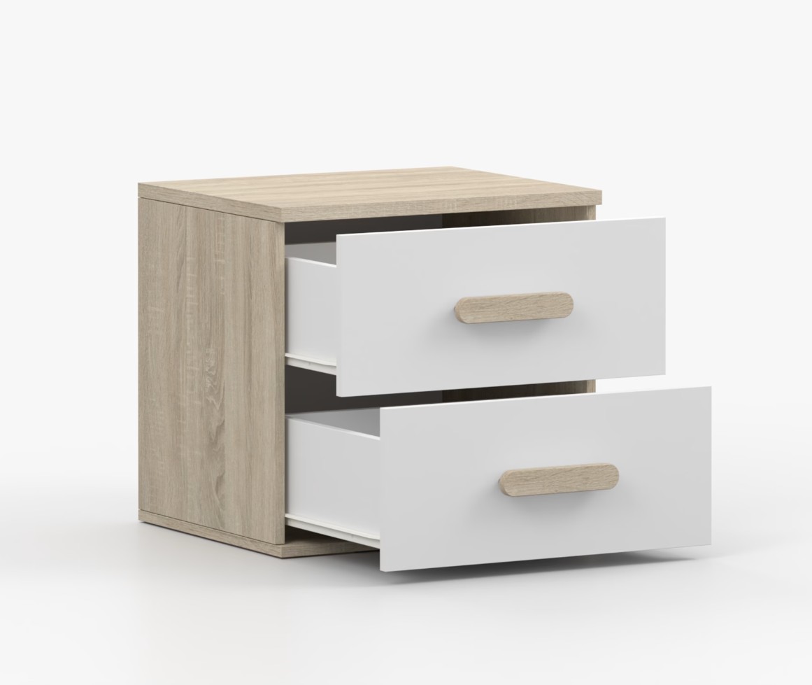 Nočný stolík SMYK je moderný a praktický kus nábytku, vyrobený z kvalitnej 16mm laminovanej dosky v dekore duba sonoma. Stolík má hrany ohranené odolnou ABS hranou, ktorá ich chráni pred mechanickým poškodením. Je vybavený dvoma priestrannými zásuvkami s drevenými farebnými úchytkami. Jeho nadčasový dizajn sa hodí do rôznych typov interiérov, napríklad do detskej izby alebo izby pre študenta.