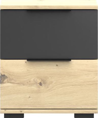 Nočný stolík Verona má kompaktné rozmery, ktoré je možné prispôsobiť aj malej miestnosti. Stolík zaujme svojim farebným prevedením v dekore duba artisan v kombinácii s čiernou farbou. Stolík je vyrobený z kvalitnej lamino dosky s hrúbkou 16 mm, ktorá je odolná proti poškriabaniu, poškodeniu, vlhkosti a vysokej teplote. Hrany sú zakončené ABS dyhou. Stolík má dve priestranné zásuvky s módnymi čiernymi kovovými úchytmi. Stôl je možné vybaviť doplnkovým nábytkom zo série Verona, čím vznikne v spálni jedinečný aranžmán.