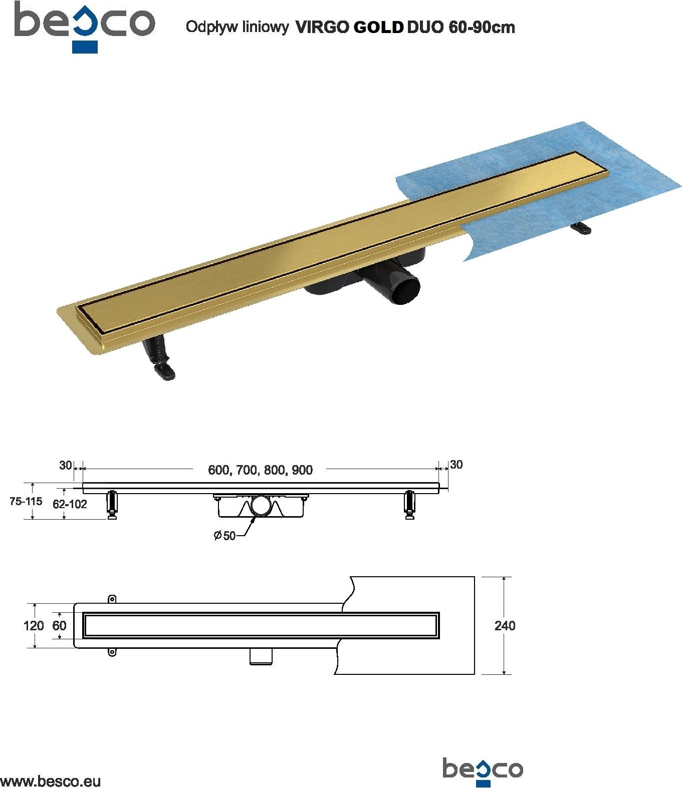 Odtokový žľab VIRGO DUO GOLD-60: dĺžka roštu 60 cm, dĺžka žľabu 66 cm