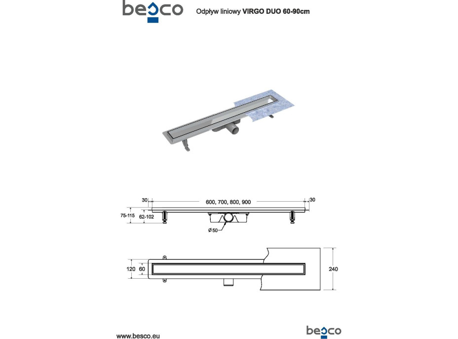 Odtokový žľab VIRGO DUO - 60: dĺžka roštu 60 cm, dĺžka žľabu 66 cm