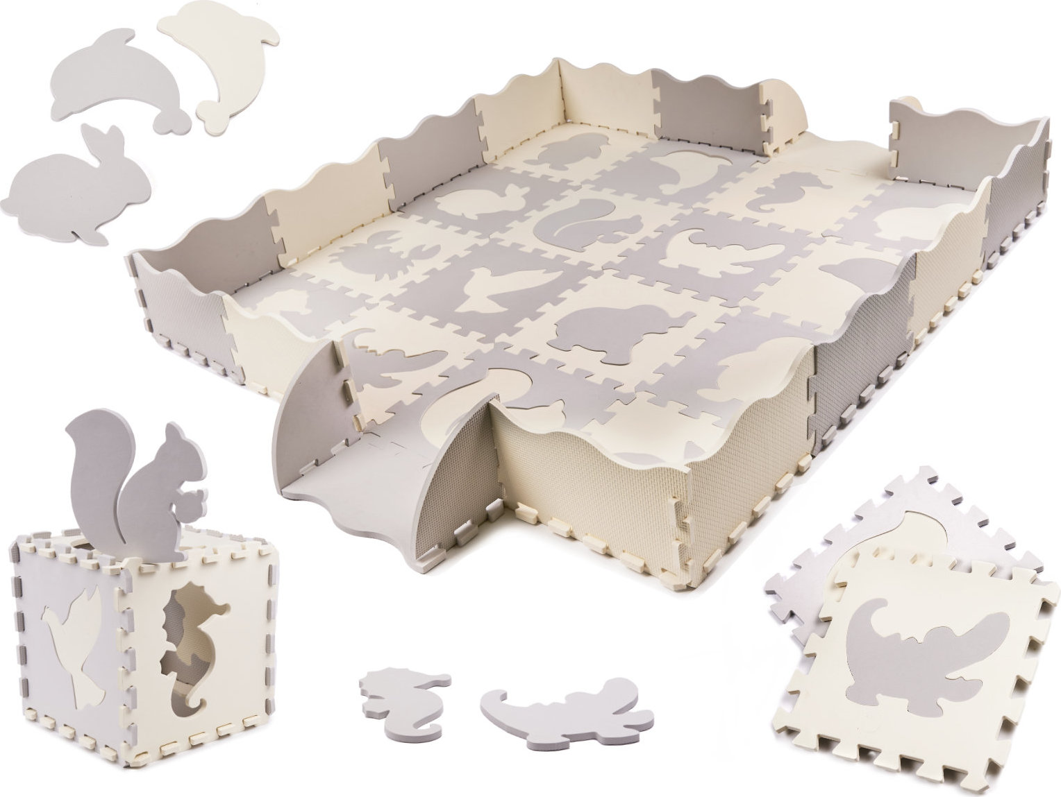 Aká je najväčšia výhoda skladačiek? To, že rastú s vašim dieťaťom! Vytvorte si z nich jedinečnú podložku alebo ohrádku, ktorá sa stane obľúbeným ihriskom každého batoľaťa. Počas prvých krôčikov dieťaťa tlmí mäkká pena všetky pády a zabraňuje otlakom na nohách dieťaťa. Ohrádka je naopak skvelým spôsobom, ako vymedziť detský hrací priestor. Odnímateľné dieliky sú ideálne na výučbu rozpoznávania tvarov. Vaše dieťa bude priraďovať vzory k správnym otvorom. Tlmené farby a zaujímavé tvary upútajú pozornosť batoliat.