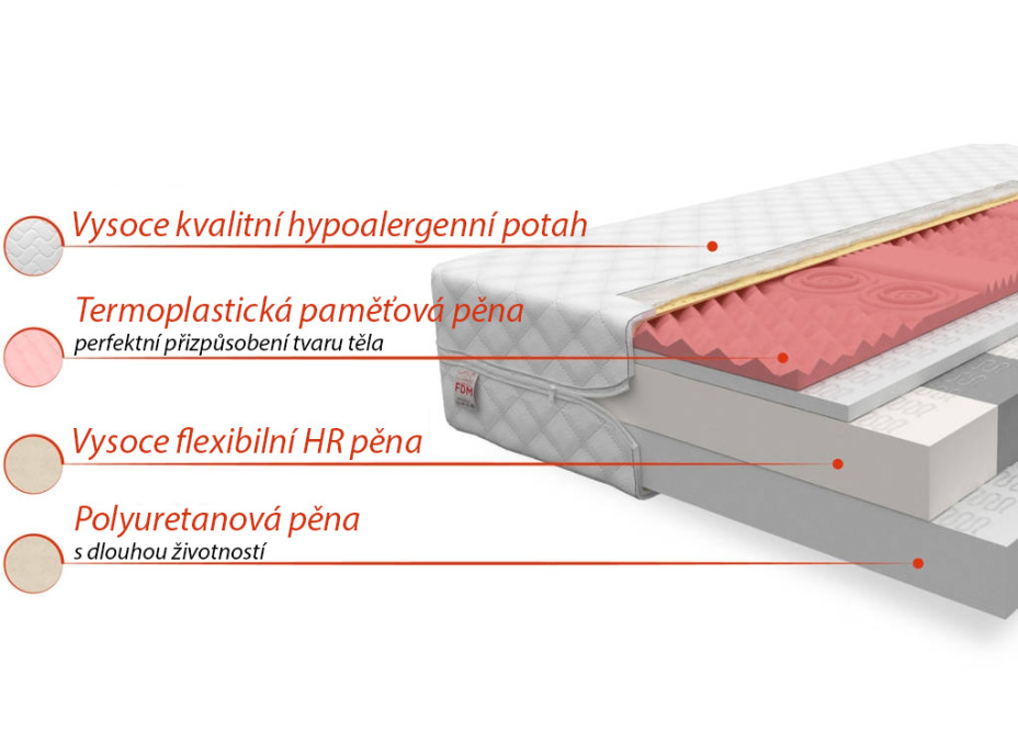 Konštrukcia jadra matraca: 2 cm termoplastická pamäťová pena, 2 cm PUR pena, 6 cm HR pena, 6 cm PUR pena