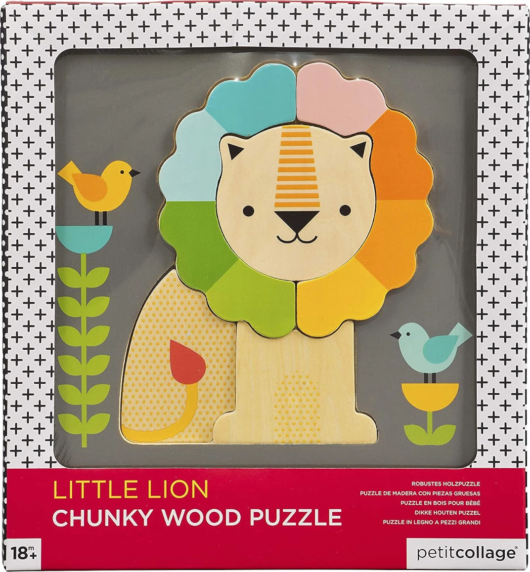 Postavte si priateľského leva s veselou dúhovou hrivou s týmto dreveným logom Little Lion Chunky od Petit Collage! Malé deti môžu ľahko uchopiť päť robustných drevených kúskov a vytvoriť tak svojho malého levieho kamaráta na farebnej scéne. Pre deti od 18 mesiacov.