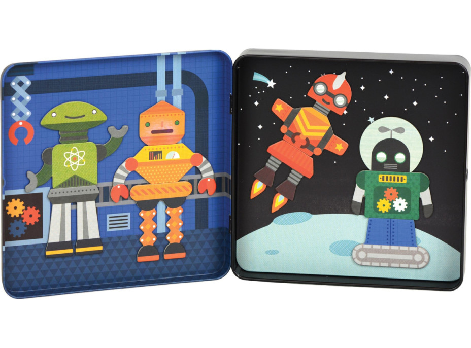 Pripnite magentov na tabuľku a vytvárajte rôzne postavičky robotov! Balenie obsahuje cez 25 magnetických dielikov, s ktorými sa deti dokážu vyhrať. Zabalené v plechovej krabičke, ktorá sa dá pevne zavrieť, perfektná hračka na cesty. Plechová krabička má vo vnútri, na stenách, dve scenérie.
