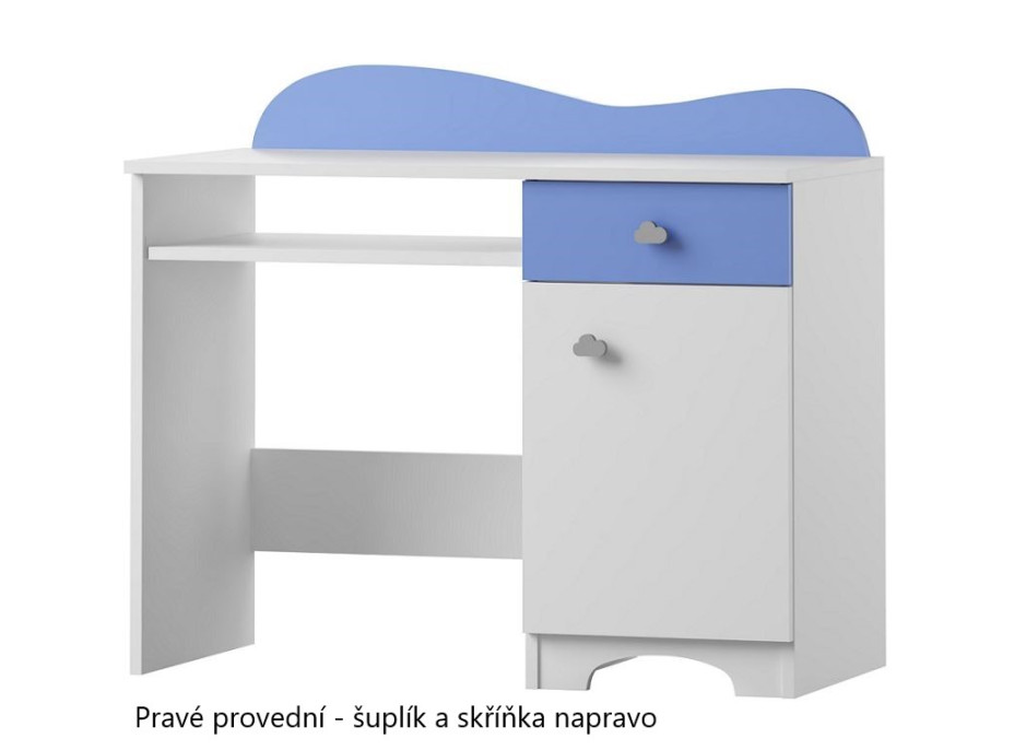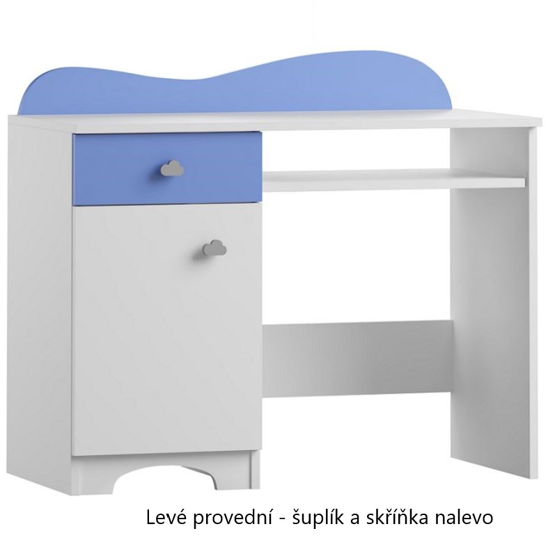 Praktický písací stôl kolekcie CLOUDS sa stane štýlovým miestom na učenie, písanie úloh i tvorenie v každej izbe. Písací stôl je vyrobený z kvalitných lamino dosiek o hrúbke 18 mm. Hrany nábytku sú zakončené ABS/PVC materiálom, ktorý ho chráni pred mechanickým poškodením a vlhkosťou. Stôl kombinuje bielu farbu s čelom šuplíka a ozdobným čelom v zadnej časti v odtieni, ktorý si môžete vybrať z našej bohatej ponuky. Stôl obsahuje šuplík, skrinku s policou a výsuvnú policu pre klávesnicu počítača. Umiestnenie šuplíka a skrinky je možné voliť na pravú alebo ľavú stranu. Čelá dvierok a šuplíka sú osadené plastovými úchytmi v tvare mráčika, charakteristickými pre celú kolekciu. Úchyty dodávajú nábytku jedinečný charakter a štýl. Vyberte si kombináciu nábytku kolekcie CLOUDS presne podľa predstáv vašich detí!