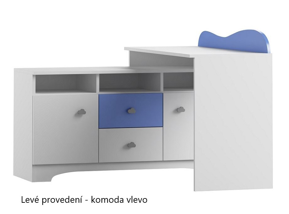 Jednoduchý písací stôl kolekcie CLOUDS vyrobený z kvalitných lamino dosiek o sile 18 mm v bielej farbe kombinovaný s praktickou komodou utvára dostatočný priestor na učenie, písanie úloh i tvorenie v každej dievčenskej i chlapčenskej izbe. Farbu čela šuplíka a ozdobného čela na zadnej strane stola si môžete vybrať z bohatej ponuky farieb. Hrany nábytku sú zakončené ABS/PVC materiálom, ktorý ho chráni pred mechanickým poškodením a vlhkosťou. Stôl obsahuje praktickú komodu s tromi otvorenými policami, dvoma šuplíkmi a dvoma skrinkami s policou po stranách. Vďaka tejto komode vzniká dostatok miesta na učebnice či ďalšie nevyhnutnosti, ktoré tak bude mať vaše dieťa stále na dosah. Pri stole je možné voliť orientáciu - umiestnenie komody na pravej alebo ľavej strane od stola. Čelá dvierok a šuplíkov sú osadené plastovými úchytmi v tvare mráčikov, charakteristickými pre celú kolekciu. Úchyty dodávajú nábytku jedinečný charakter a štýl. Vyberte si kombináciu nábytku kolekcie CLOUDS presne podľa predstáv vašich detí!