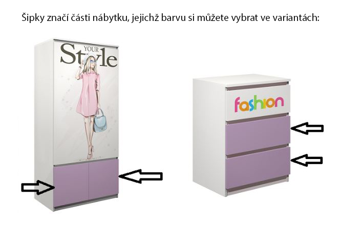 Grafika nábytku je natlačená ekologickými farbami, ktoré sú tvrdené UV žiarením (tlač má vysokú odolnosť proti oderu a poškrabaniu - nejedná sa o nálepku).