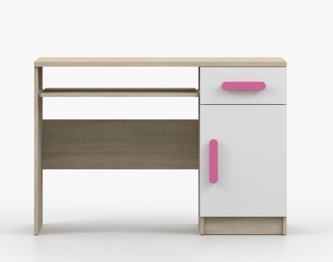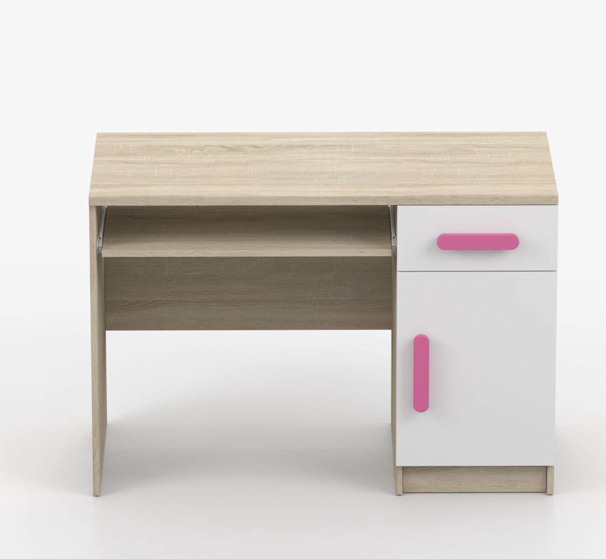 Pre študentov aj kancelárske prostredie je písací stôl SCOUT ideálnou voľbou. Ponúka veľkú pracovnú plochu, na ktorej nájdete dostatok miesta na prácu aj štúdium. Zásuvka pod pracovnou doskou umožňuje uloženie klávesnice počítača a šuplík na príslušenstvo uľahčí organizáciu pracovného priestoru. Praktická skrinka s policou je umiestnená pod šuplíkom. Farebné úchytky z PVC pridávajú zaujímavý designový prvok k tomuto praktickému kusu nábytku.