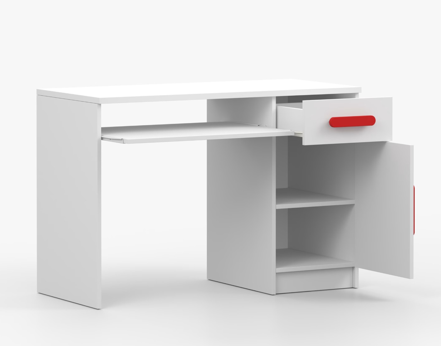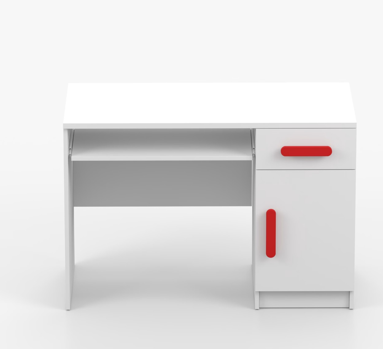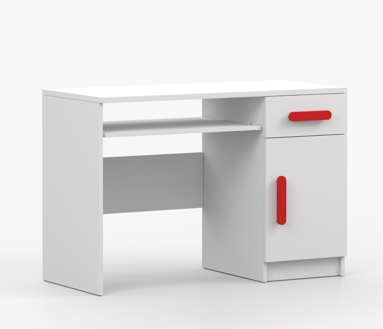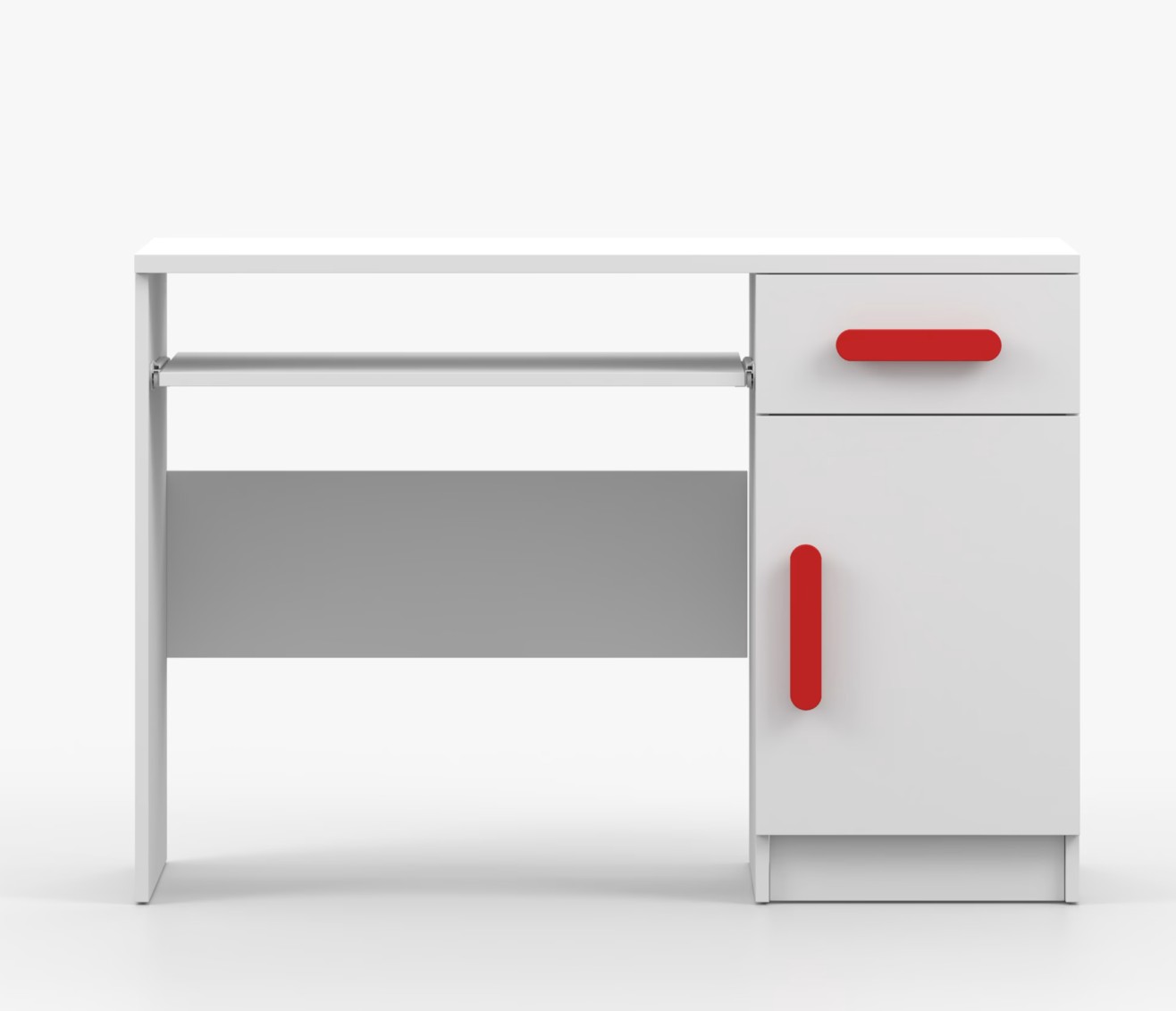 Pre študentov aj kancelárske prostredie je písací stôl SMYK ideálnou voľbou. Ponúka veľkú pracovnú plochu, na ktorej nájdete dostatok miesta na prácu aj štúdium. Zásuvka pod pracovnou doskou umožňuje uloženie klávesnice počítača a šuplík na príslušenstvo uľahčí organizáciu pracovného priestoru. Praktická skrinka s policou je umiestnená pod šuplíkom. Farebné úchytky z PVC pridávajú zaujímavý designový prvok k tomuto praktickému kusu nábytku.