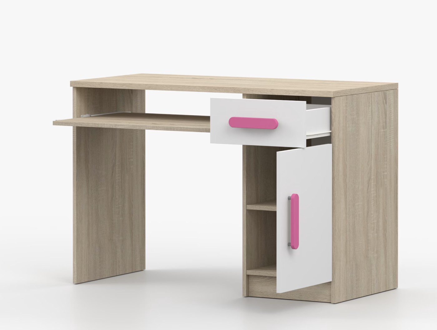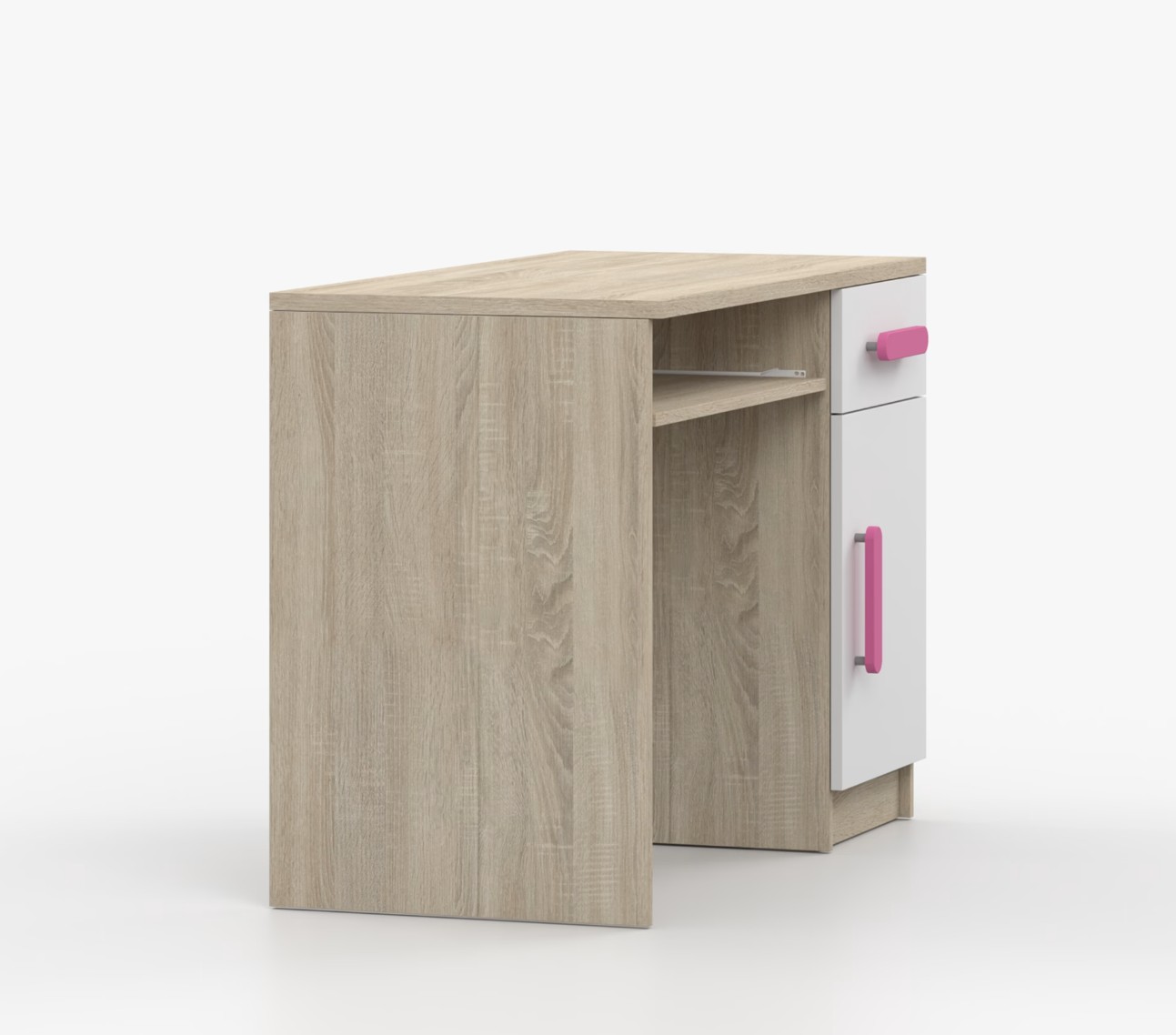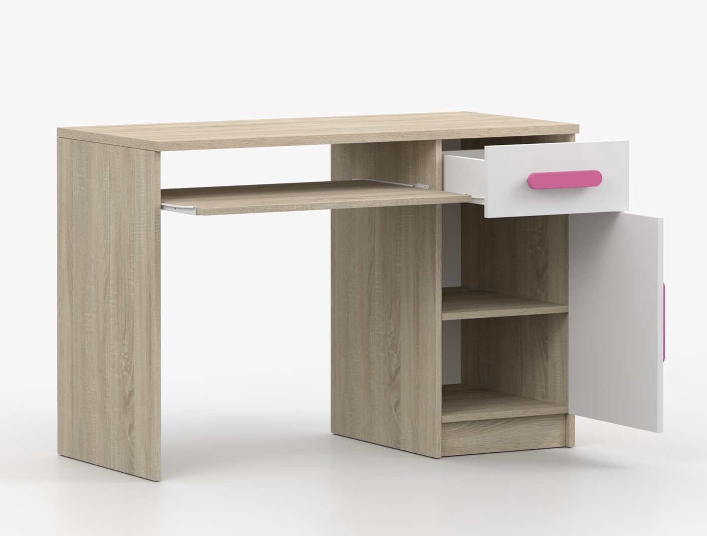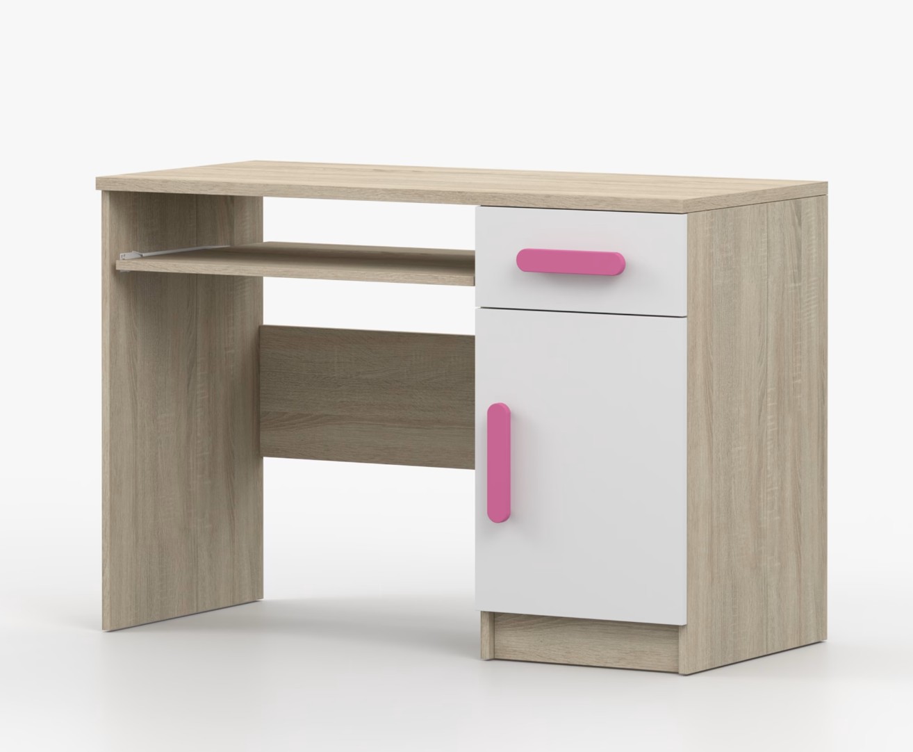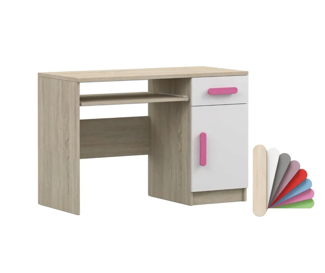 Pre študentov aj kancelárske prostredie je písací stôl SMYK ideálnou voľbou. Ponúka veľkú pracovnú plochu, na ktorej nájdete dostatok miesta na prácu aj štúdium. Zásuvka pod pracovnou doskou umožňuje uloženie klávesnice počítača a šuplík na príslušenstvo uľahčí organizáciu pracovného priestoru. Praktická skrinka s policou je umiestnená pod šuplíkom. Farebné úchytky z PVC pridávajú zaujímavý designový prvok k tomuto praktickému kusu nábytku.