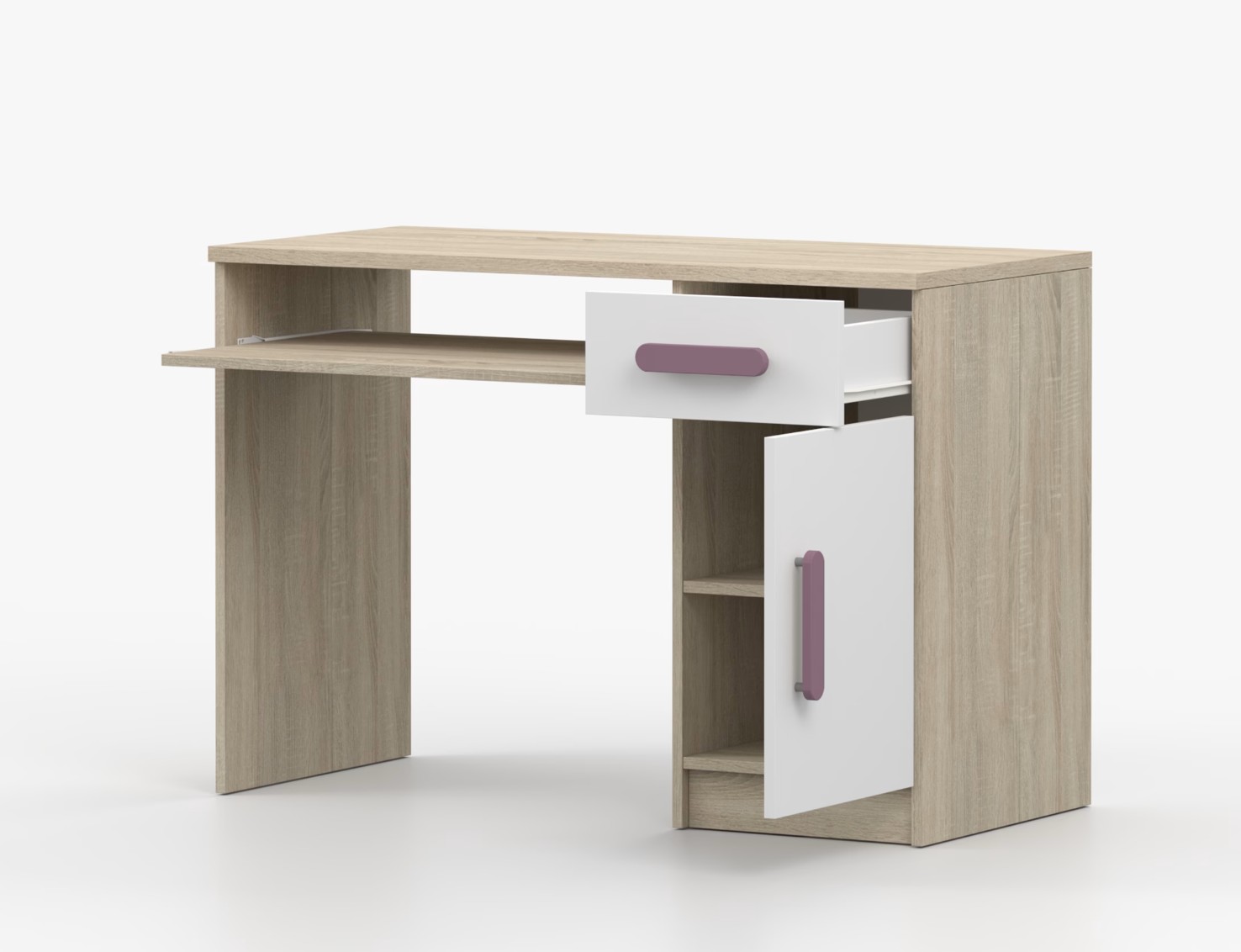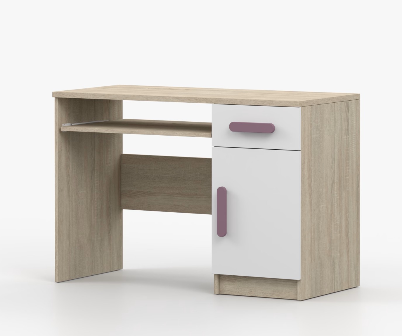 Pre študentov aj kancelárske prostredie je písací stôl SMYK ideálnou voľbou. Ponúka veľkú pracovnú plochu, na ktorej nájdete dostatok miesta na prácu aj štúdium. Zásuvka pod pracovnou doskou umožňuje uloženie klávesnice počítača a šuplík na príslušenstvo uľahčí organizáciu pracovného priestoru. Praktická skrinka s policou je umiestnená pod šuplíkom. Farebné úchytky z PVC pridávajú zaujímavý designový prvok k tomuto praktickému kusu nábytku.