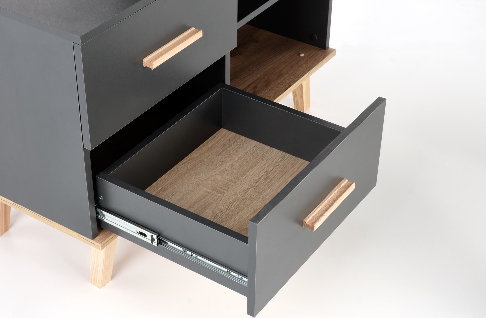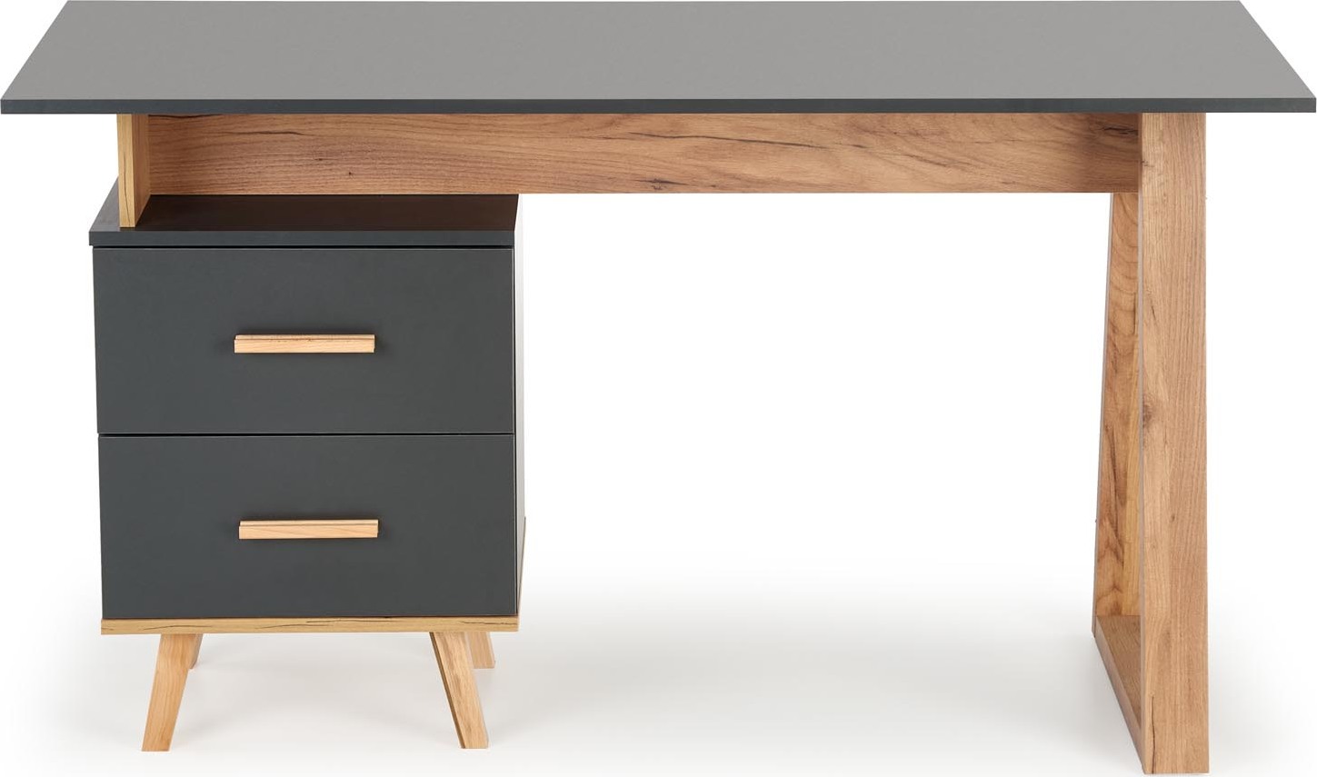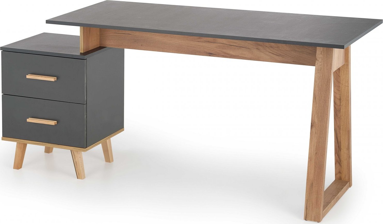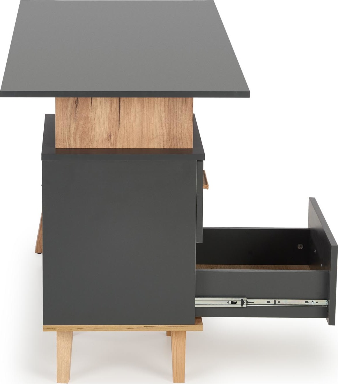 Moderný písací stôl vhodný nielen do každej študentskej izby. Dosky písacieho stola a poličiek sú vyrobené z kvalitnej lamino dosky potiahnutej fóliou. V ľavej časti stola nájdete namiesto nôh menší stolík s dvoma šuplíkmi. Pri montáži si sami môžete zvoliť ako hlboko chcete tento stolík zasadiť do konštrukcie stola, čím si sami určíte celkovú dĺžku stola. Kombinácia moderného dekoru duba votan so šedou farbou robí zo stola nadčasový kúsok, ktorý je nielen funkčný, ale aj skvelým dizajnovým doplnkom.