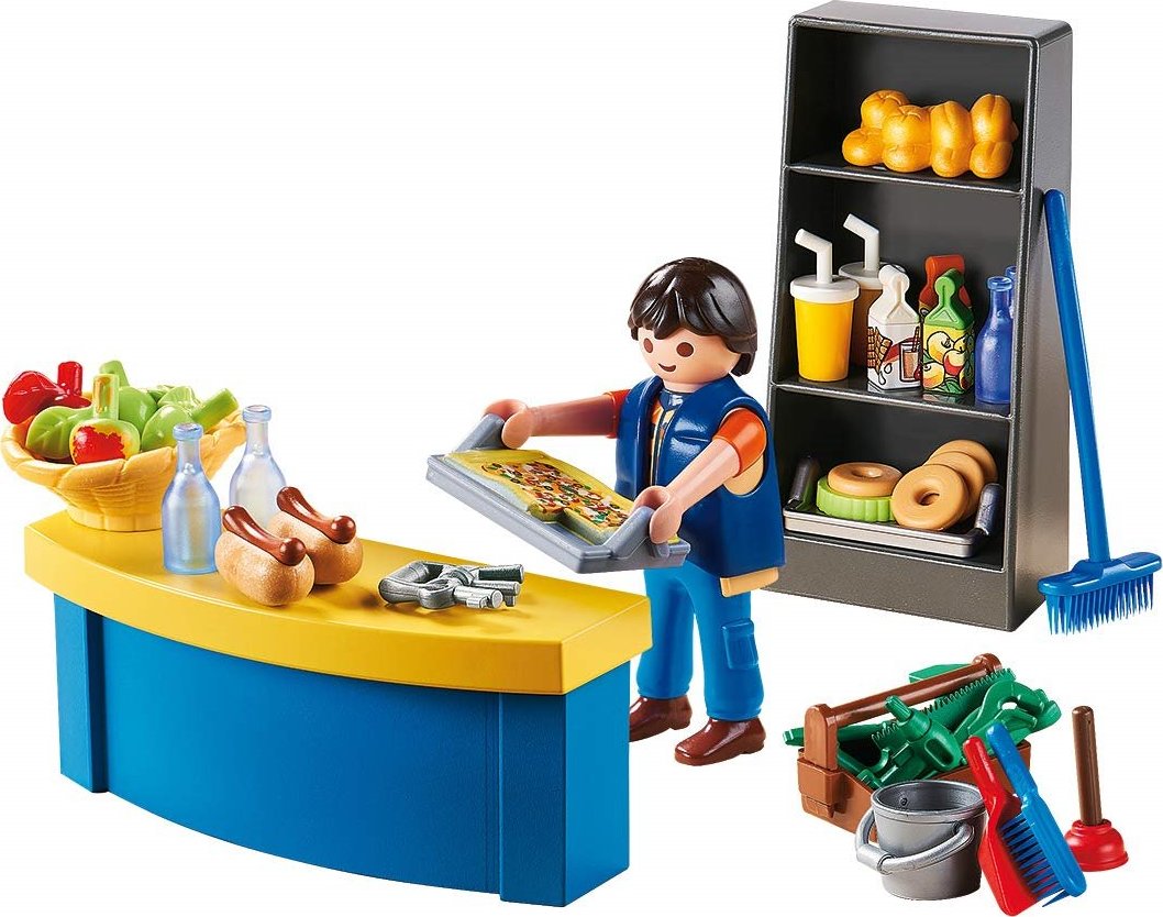 Žiaci a učitelia si počas prestávky môžu kúpiť desiatu v školskom bufete, kde predáva pán školník. V dobe vyučovania má potom správca prácu okolo školy, drobné opravy, upratovanie... Balenie obsahuje: 1 figúrku (7,5 cm), pult, regál, zmeták, lopatku so metličkou, škatuľu s náradím, zväzok kľúčov, vedierko, košík s ovocím a ďalšie doplnky. PLAYMOBIL sú stavebnice pre deti rôznych vekových kategórií, ktoré sú tematicky zamerané a majú mnoho prepracovaných doplnkov. Dieliky sú hygienické, ľahko umývateľné a nepúšťajú farbu. Stavebnice Playmobil podnecujú fantáziu, kreativitu a podporujú detský vývoj.Vlastnosti