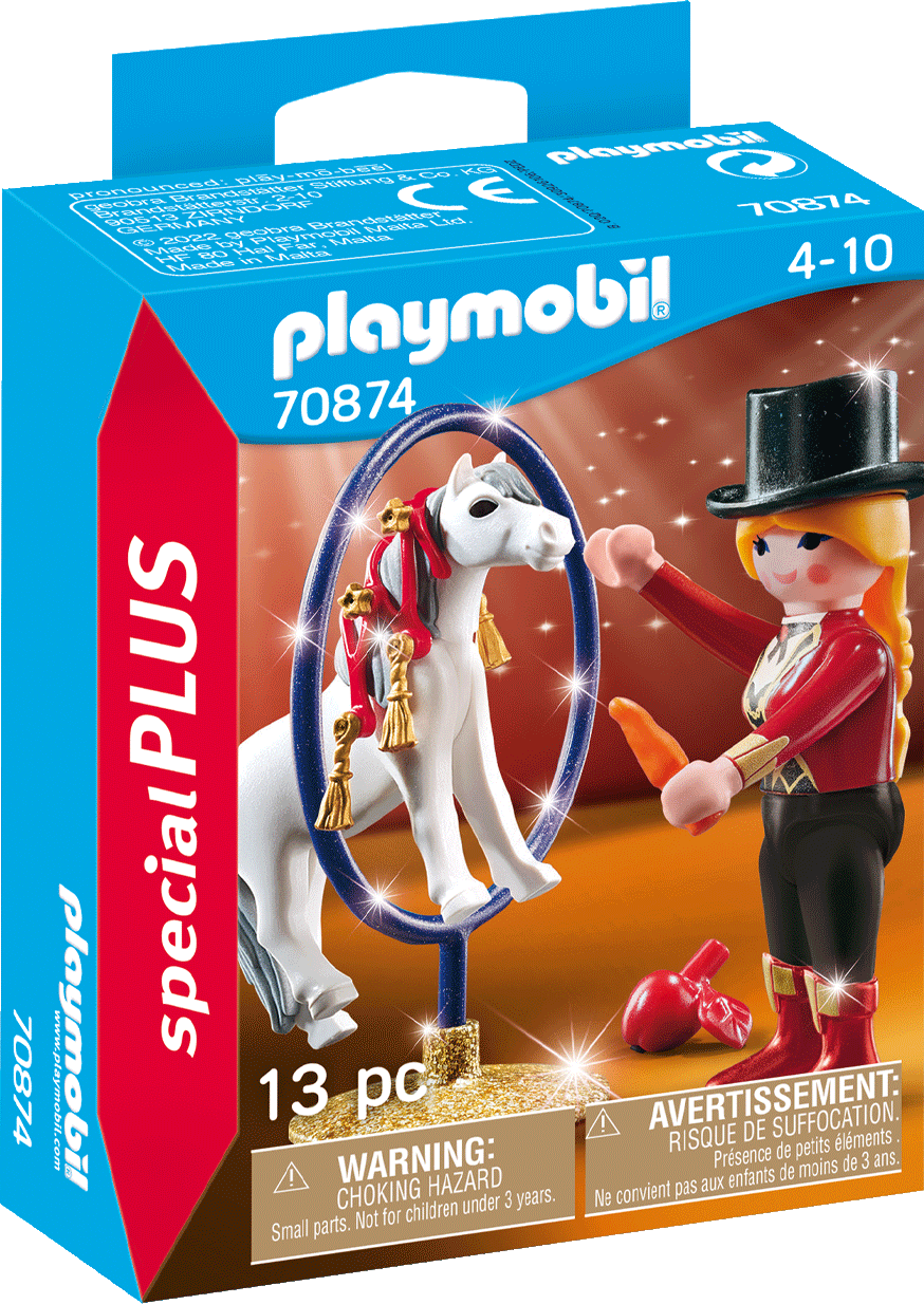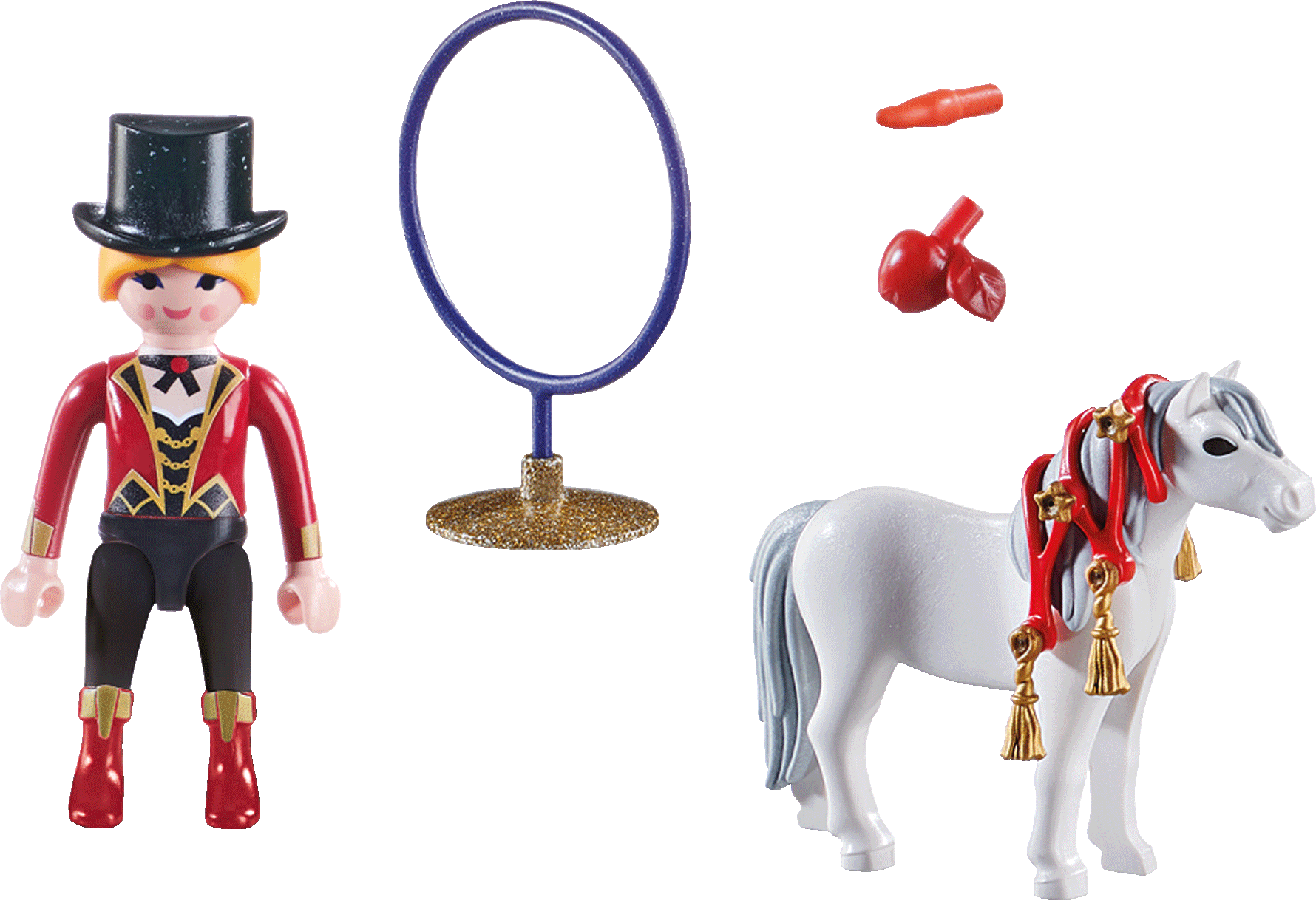 Veľká dôvera medzi človekom a koňom je predpokladom úspešnej drezúry koňa. Tí dvaja spolu pracujú na svojich vystúpeniach každý deň po mnoho rokov. Dnes je deň veľkého predstavenia. Hriva koňa je slávnostne vyzdobená a umelec má na sebe elegantný kostým. Zdvihnite oponu a vystúpenie môže začať! balenie obsahuje: 1x figúrku, 1x figúrku koňa a ďalšie doplnky Playmobil sú stavebnice pre deti rôznych vekových kategórií, ktoré sú tematicky zamerané a majú mnoho prepracovaných doplnkov. Dieliky sú hygienické, ľahko umývateľné a nepúšťajú farbu. Stavebnice Playmobil podnecujú fantáziu, kreativitu a podporujú detský vývoj. Vhodné pre deti od 4 rokov. Téma: PLAYMOBIL® PanáčikoviaVlastnosti