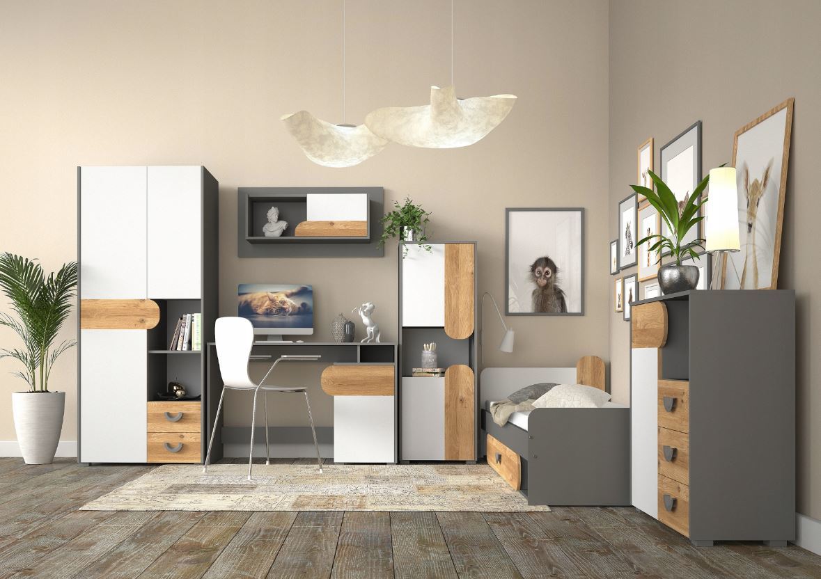 Praktická polica z kolekcie CARINI sa skvele hodí do detských i obývacích izieb, spální alebo izieb pre mládež zariadených v modernom štýle. Produkty z kolekcie CARINI sa vyznačujú farebnou kombináciou žiarivo bielej farby so svetlo šedou farbou a dekorom duba v odtieni nash. Navyše sa celá kolekcia vyznačuje zaoblenými prvkami, ktoré jej dodávajú veľmi originálny vzhľad. Polica je vyrobená z kvalitných laminátových drevotrieskových dosiek, ktoré majú umývateľnú vrchnú vrstvu a sú odolné voči poškriabaniu. Okraje sú chránené PVC dyhou, čím sa zvyšuje odolnosť nábytku. Odporúčame nábytok skombinovať s ďalšími produktmi kolekcie CARINI a urobiť tak z izby príjemné, oku lahodiace prostredie.
