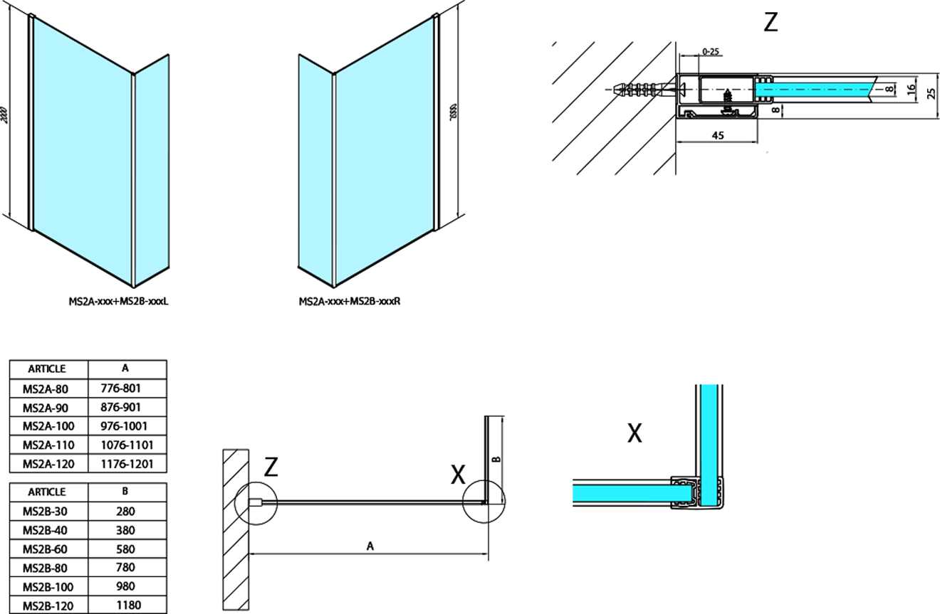 Aby vznikla dvojdielna zástena v tvare "L", je potrebné k pevnej stene dokúpiť prídavný pevný panel MS2B.