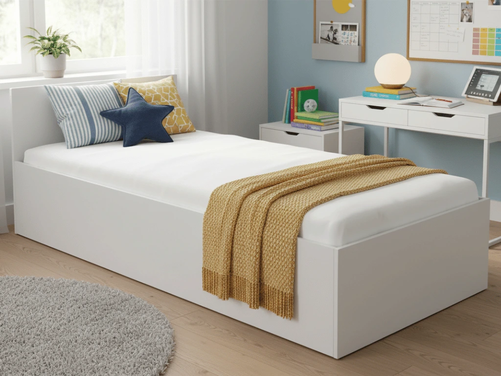 Jednolôžková posteľ ORVILLE II je ideálna do detskej izby alebo izby pre študenta. Posteľ poskytuje pocit komfortu vďaka svojej pevnej konštrukcii a modernému, tradičnému vzhľadu. Je vyrobená z kvalitnej laminovanej dosky s hrúbkou 16 mm, ktorá je odolná proti poškriabaniu, poškodeniu, vlhkosti a vysokým teplotám. Hrany sú zakončené ABS lištou, čo zaisťuje ich odolnosť a pevnosť. Posteľ je vybavená úložným priestorom pod vyklápacou doskou, ktorá slúži ako rošt. Vďaka tomuto praktickému riešeniu máte vždy po ruke dostatok miesta na uloženie prikrývok, vankúšov a ďalších vecí.