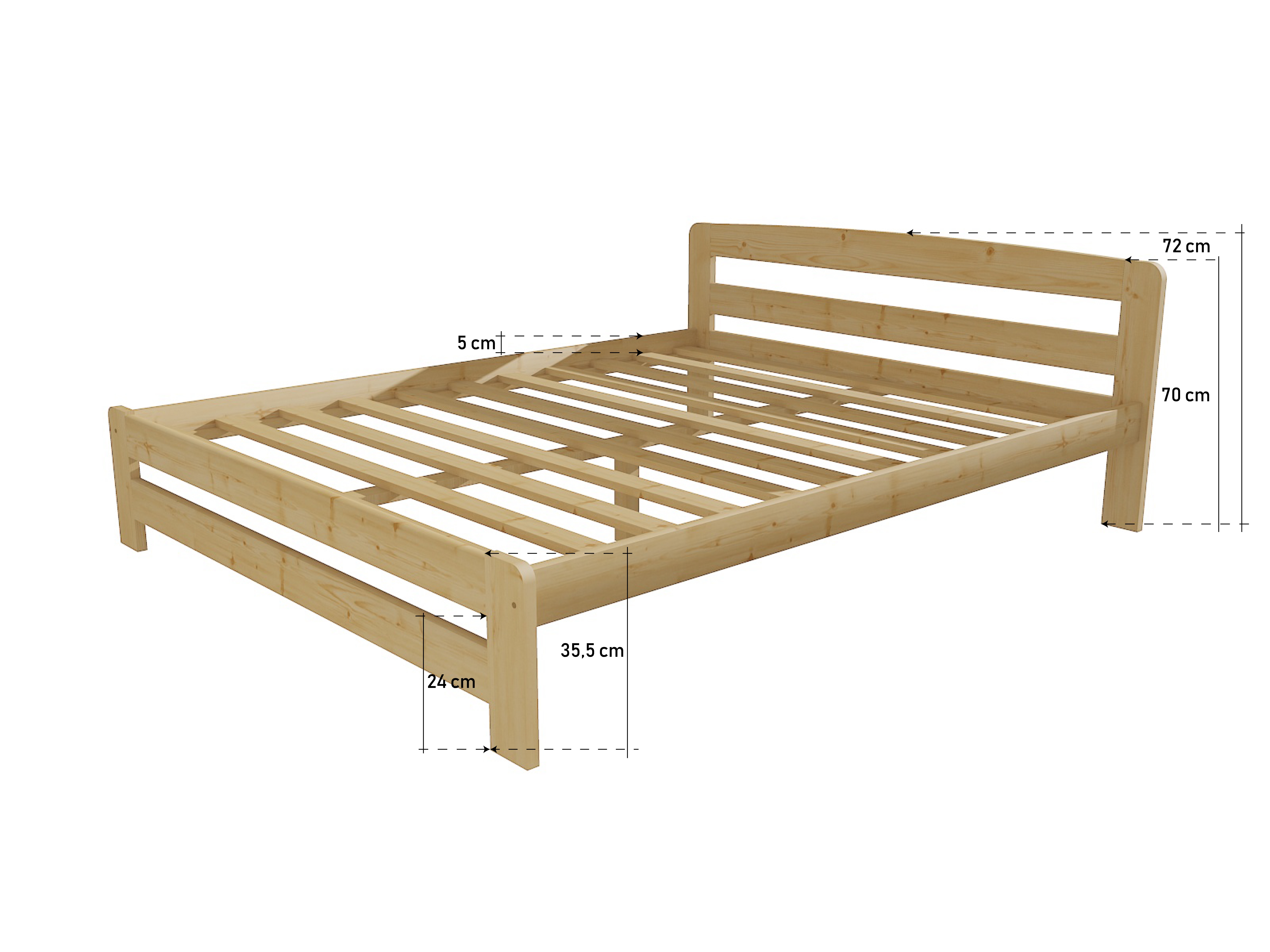 Kvalitné a stabilné drevená posteľ by mala byť základom každej spálne alebo detskej izby. Precízne spracovanie dreva tej najvyššej kvality zaručuje u tejto postele dlhú životnosť. Použitý materiál je masív borovica o šírke 2,6 cm. Aby sa predišlo úrazom, sú hrany postele zaoblené. Posteľ vám na prianie môžeme dodať v surovom stave bez povrchových úprav (iba dohladka obrúsenou) alebo môžete zvoliť ošetrenie povrchu nezávadným ekologickým lakom, takže krásne vynikne štruktúra dreva borovice. Prípadne si môžete vybrať z morenia dreva v odtieňoch jelša, duba a orechu alebo niektorú z obľúbených farieb. Toto dvojposteľ možno kombinovať s každým výrobkom vyrobeným z borovicového masívu. Táto posteľ je vhodná do študentskej izby, spálne, prípadne svoje uplatnenie nájde na chate alebo chalupe. Prednosťou postele je masívny rám, ktorý svojím dizajnom pôsobí veľmi príjemne a elegantne. Výrobok je dodávaný v demonte vrátane obrazového návodu.