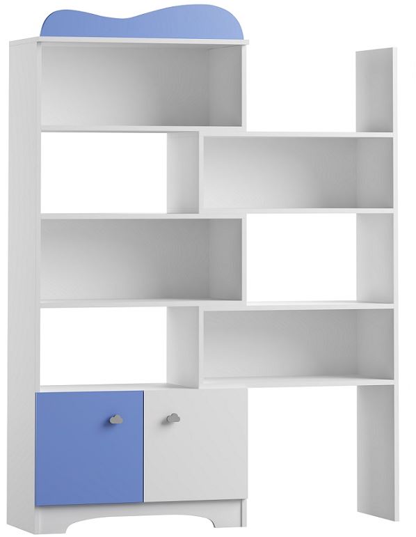 Praktický úložný regál CLOUDS, ktorý skvele poslúži ako knižnica, je vyrobený z kvalitných lamino dosiek s hrúbkou 18 mm v bielej farbe kombinovanej s farebnými dvierkami podľa vášho výberu. Hrany nábytku sú zakončené ABS/PVC materiálom, ktorý ho chráni pred mechanickým poškodením a vlhkosťou. Veľkou prednosťou tohto regálu je možnosť regulácie jeho šírky. Šírka regálu je nastaviteľná od 80 cm do 140 cm. V závislosti na vašich potrebách je možné ju rozšíriť z 80cm na 100cm, 120c alebo 140cm vďaka vopred pripraveným nastavovacím otvorom. Tento kus nábytku tak umožňuje optimálne využitie akéhokoľvek voľného priestoru v detskej izbe. Regál obsahuje otvorené police kombinované s uzavretými skrinkami. Čelá dvierok sú osadené plastovými úchytmi v tvare mráčikov, charakteristickými pre celú kolekciu. Úchyty dodávajú nábytku jedinečný charakter a štýl. Kombinujte nábytok z kolekcie CLOUDS presne na mieru veľkosti izby aj potrebám svojich detí.