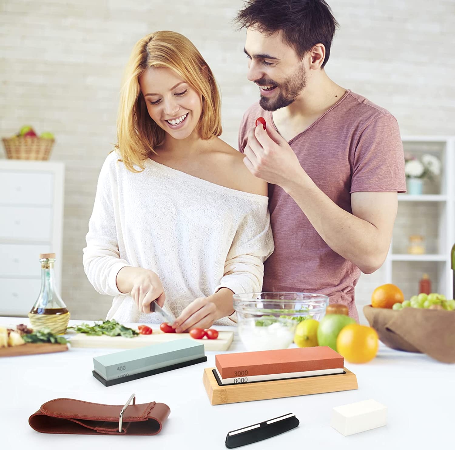 Všetky potrebné nástroje na brúsenie v jednej profesionálnej sade - vysoko kvalitný brúsny kameň 400/1000 3000/8000, bambusová základňa, uhlový kameň, vyrovnávací kameň, kožený remeň.