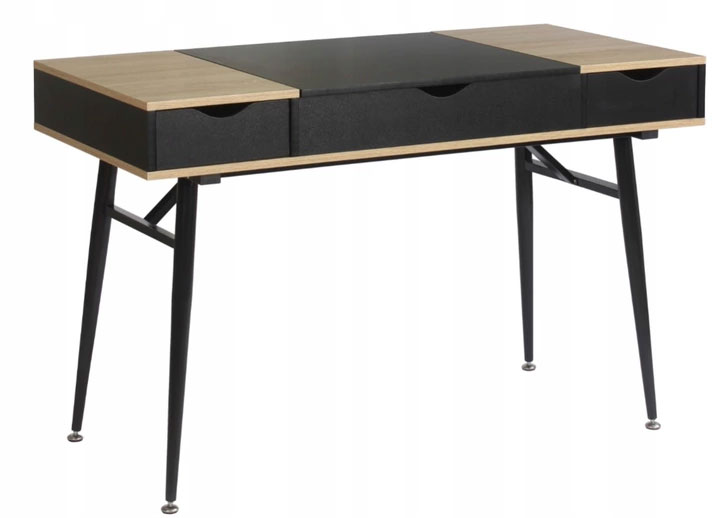 Moderný písací stôl vhodný nielen do každého študentskej izby. Dosky písacieho stola sú vyrobené z kvalitnej a odolnej MDF dosky potiahnuté fóliou obľúbeného dekoru dub sonoma v kombinácii s čiernou farbou. Spolu s konštrukciou z ocele čiernej práškovej farby vytvára stabilné a kvalitné písací stôl. Ako ukladací priestor slúžia dva šuplíky po stranách a jedna schovaná police v prostrednej časti. K tej sa dá dostať zdvihnutím stredovej dosky.